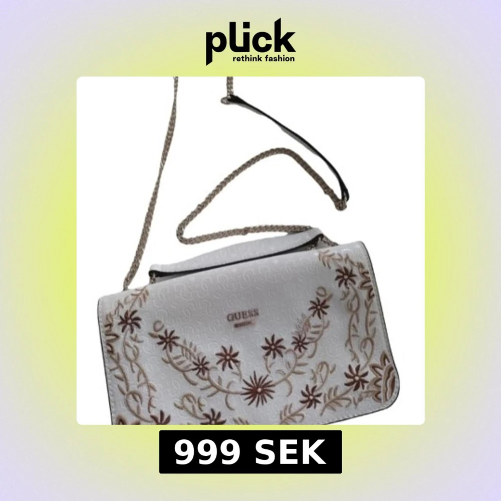 Snygg vit axelväska från Guess med vackra broderade blommor i beige och brunt. Väskan har en elegant kedjerem och subtilt mönster i tyget. Perfekt för att ge en stilfull touch till din outfit. (Som ny, bara etiketten som fattas)