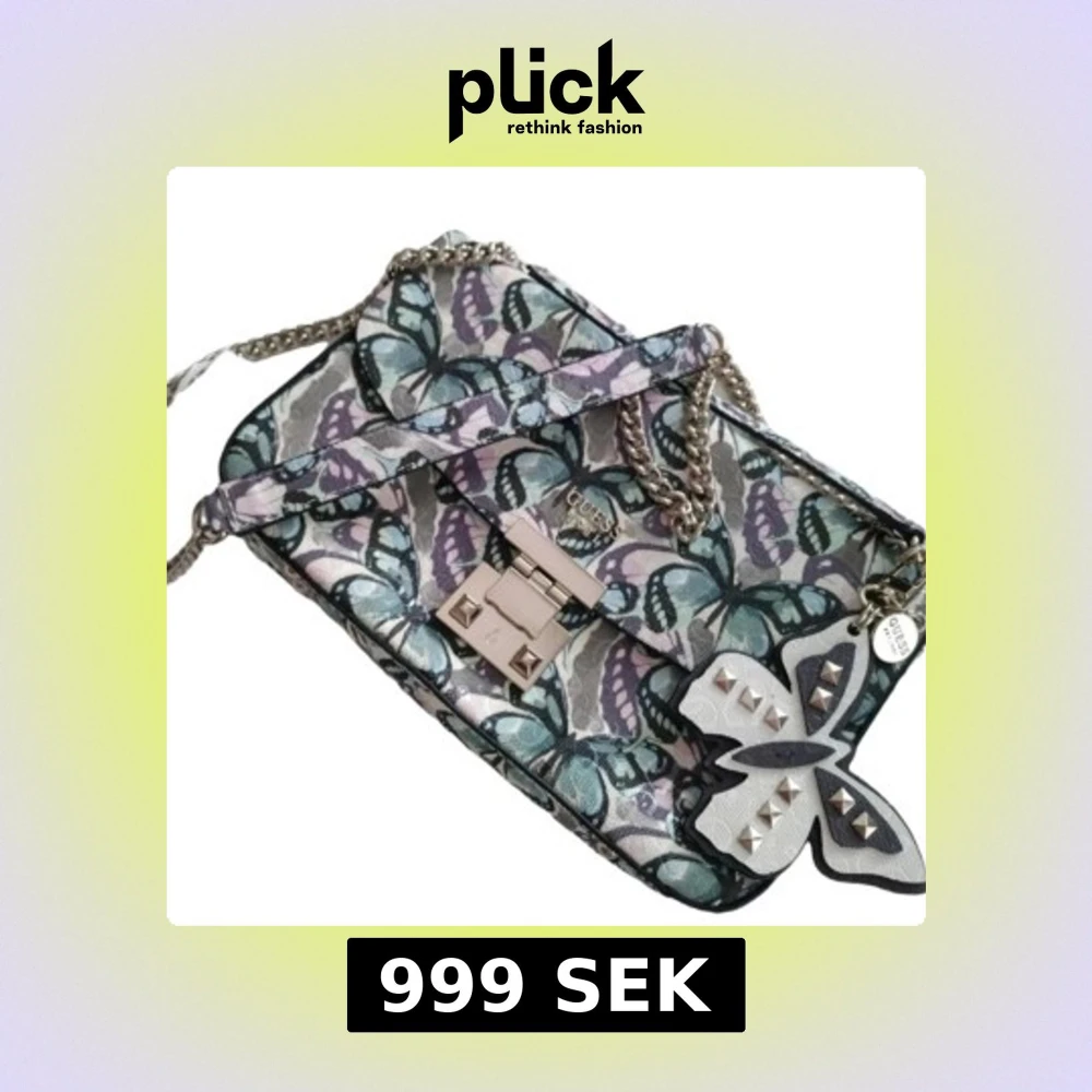 Snygg axelväska från Guess med fjärilsmönster i lila, blå och gröna nyanser. Väskan har en kedja som axelrem och ett dekorativt fjärilshänge med nitar. Perfekt för att ge din outfit en färgglad touch! (Som ny!, etiketten saknas)