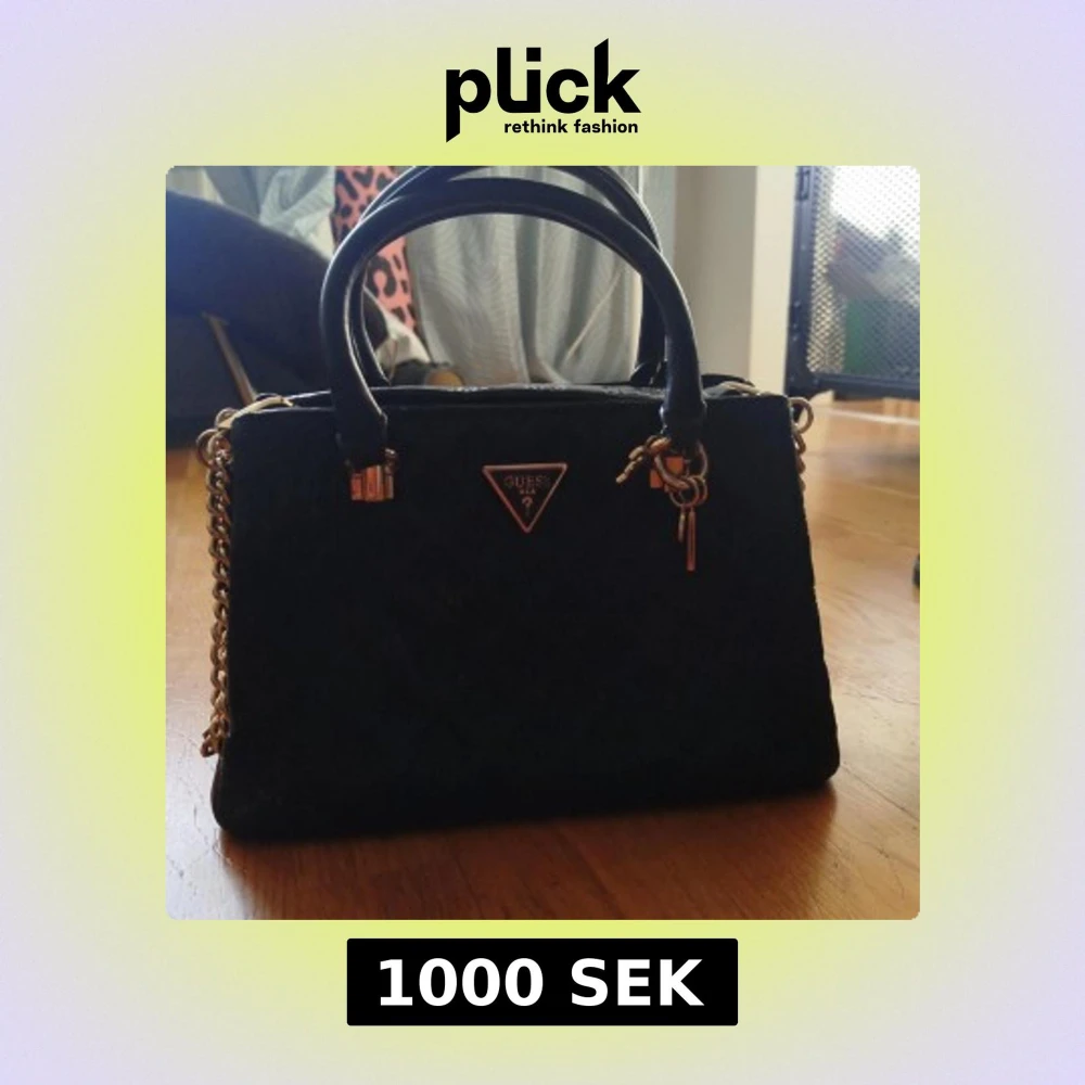 Snygg svart handväska från Guess med gulddetaljer och kedjeaxelrem. Väskan har en dragkedja på baksidan och ett triangulärt Guess-emblem på framsidan. Perfekt för att ge en elegant touch till din outfit. Aldrig använd! Nypris 2000:-