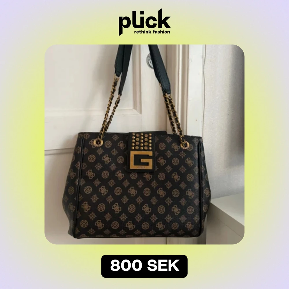 Axelväska från Guess i färgen Mocha logo med gulddetaljer. Väskan är i nyskick då den inte kommit till användning så många gånger. Mått 35x27 cm. Dustbag ingår.