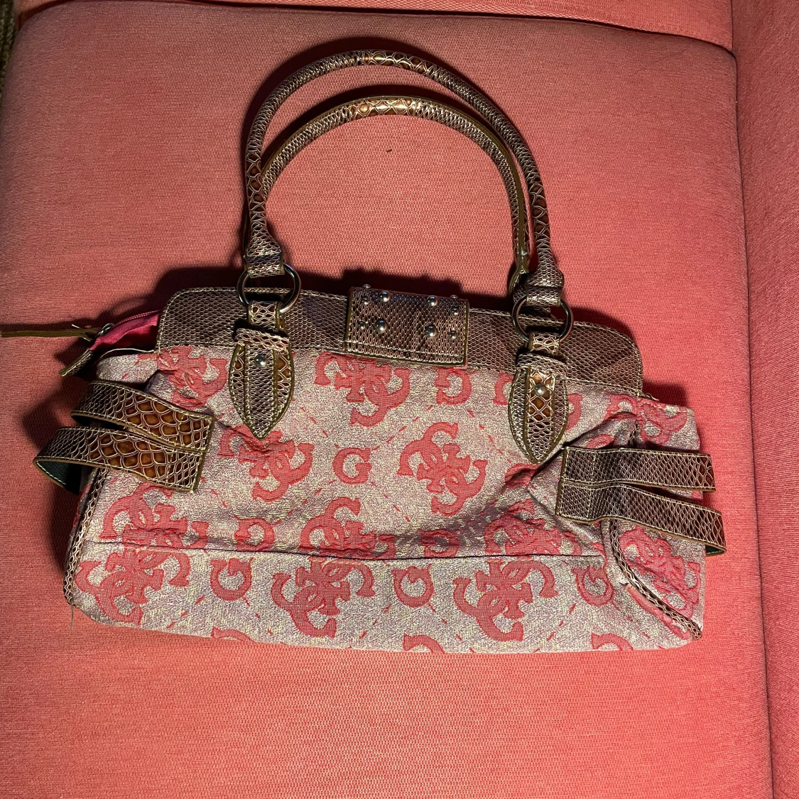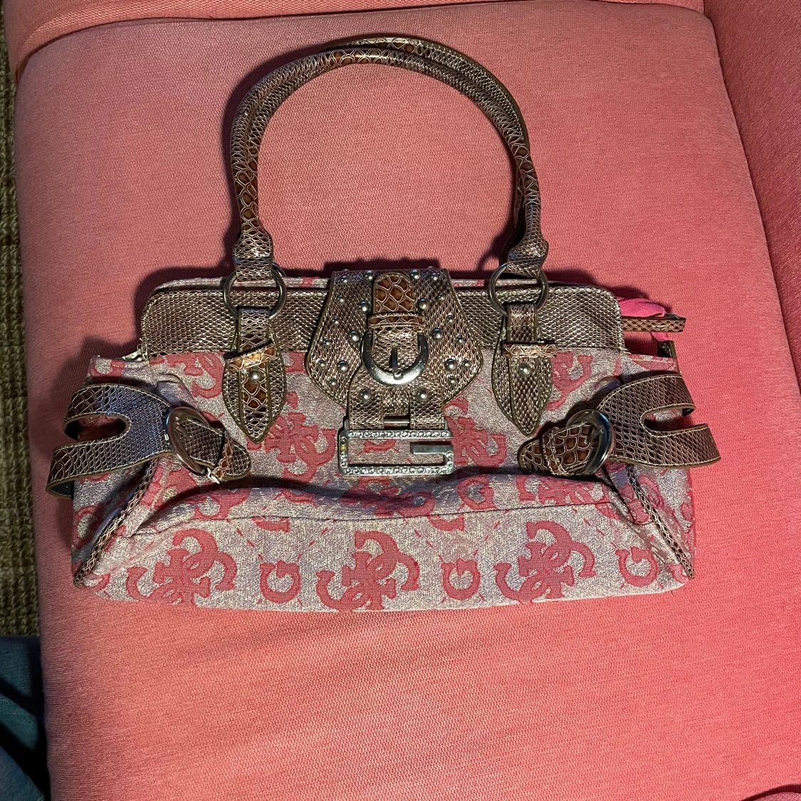 Säljer en superfin handväska från guess då den inte komma till användning. Köpt på loppis för 500kr (så kan tyvärr inte garantera att den är riktig), pris kan diskuteras vid snabb affär. Höjd: 22cm Bredd: ca. 37cm djup: ca. 11cm