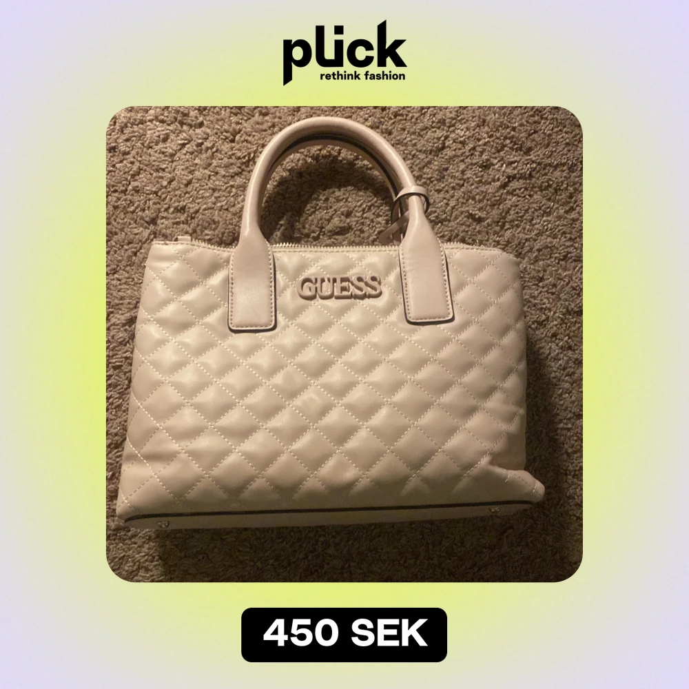 Säljer en superfin beige handväska från Guess i quiltat mönster. Väskan har två handtag och en dragkedja upptill. Insidan är fodrad med Guess-logotypen och har flera fack för bra förvaring. Perfekt för både vardag och fest!