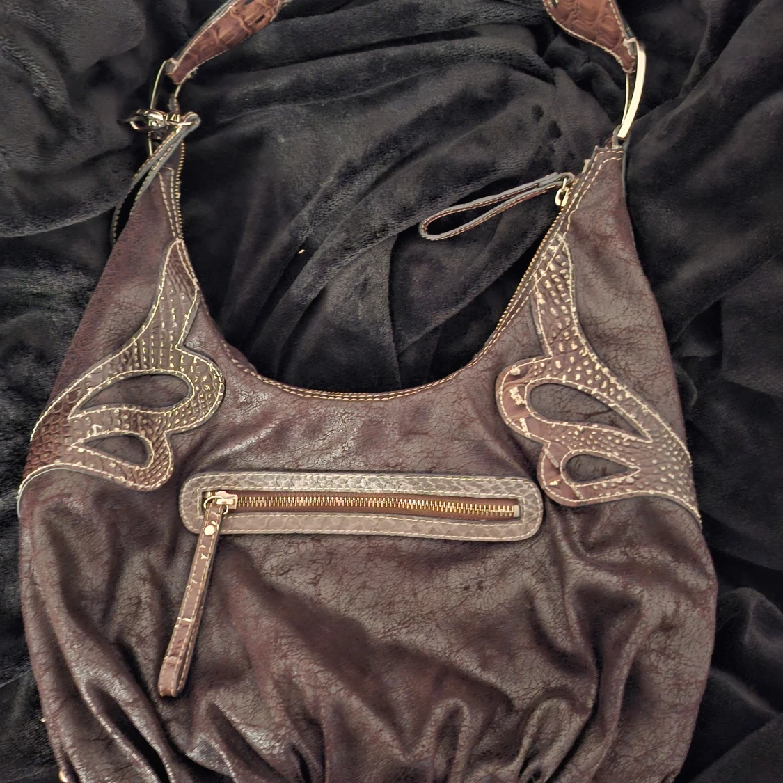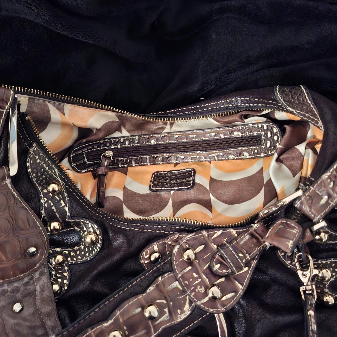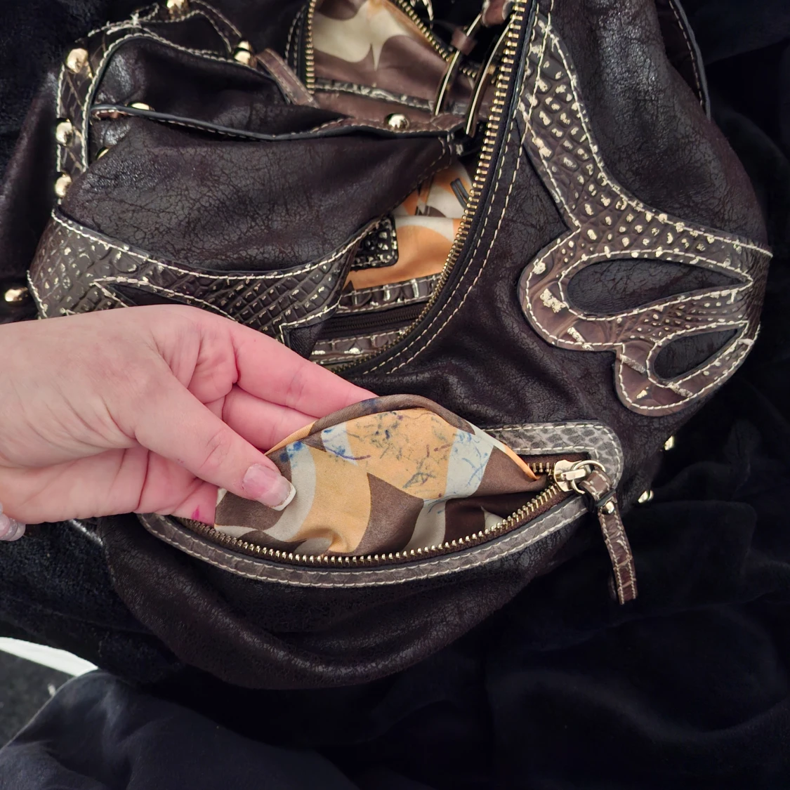 Ăkta Guess vĂ€ska med 2000s stil. VĂ€ldigt rymlig med snygga detaljer och Ă€ven en innerficka i vĂ€skan & en ficka pĂ„ baksidan. I fickan pĂ„ baksidan har det tyvĂ€rr blivit spĂ„r med blĂ€ck som man kan se pĂ„ sista bildenđ