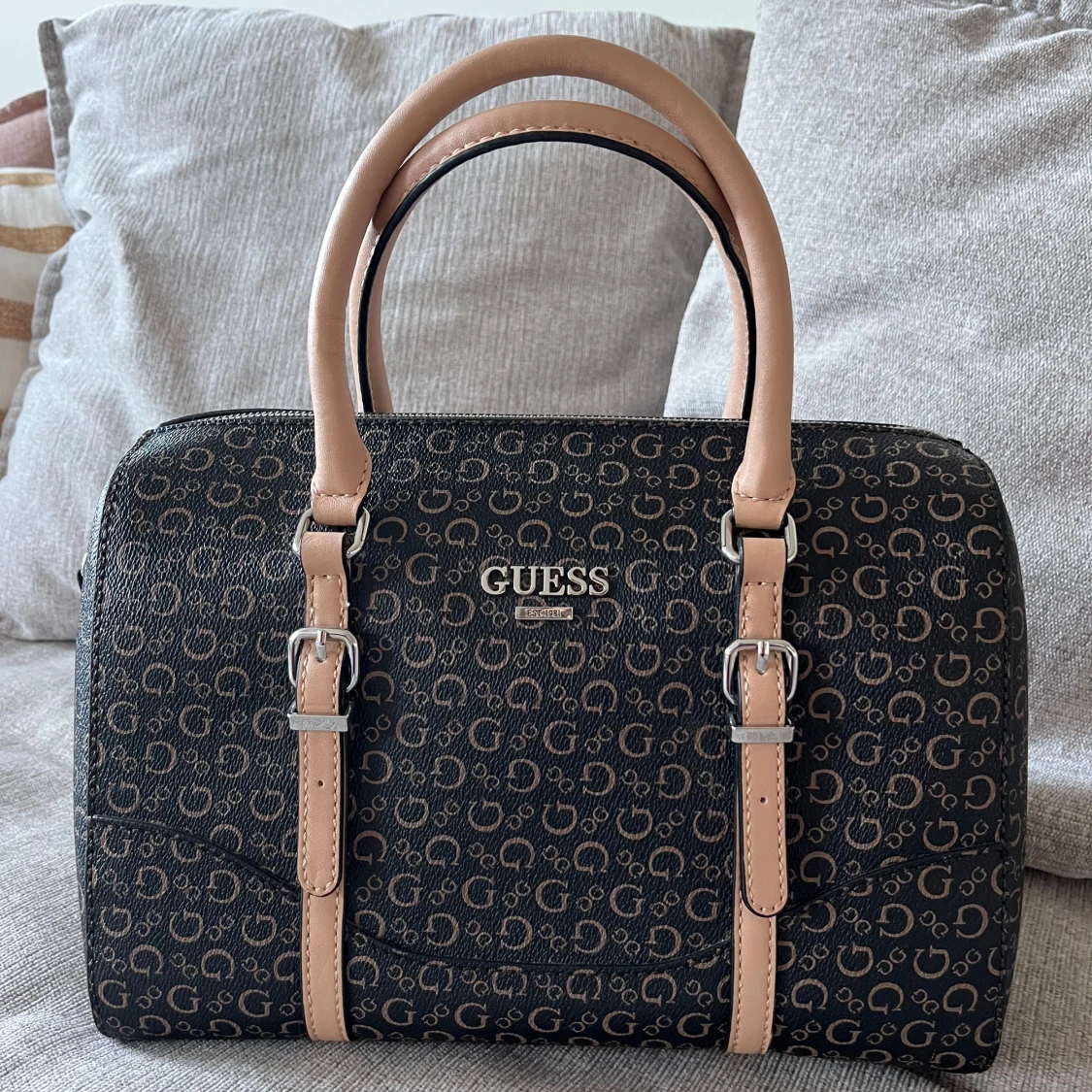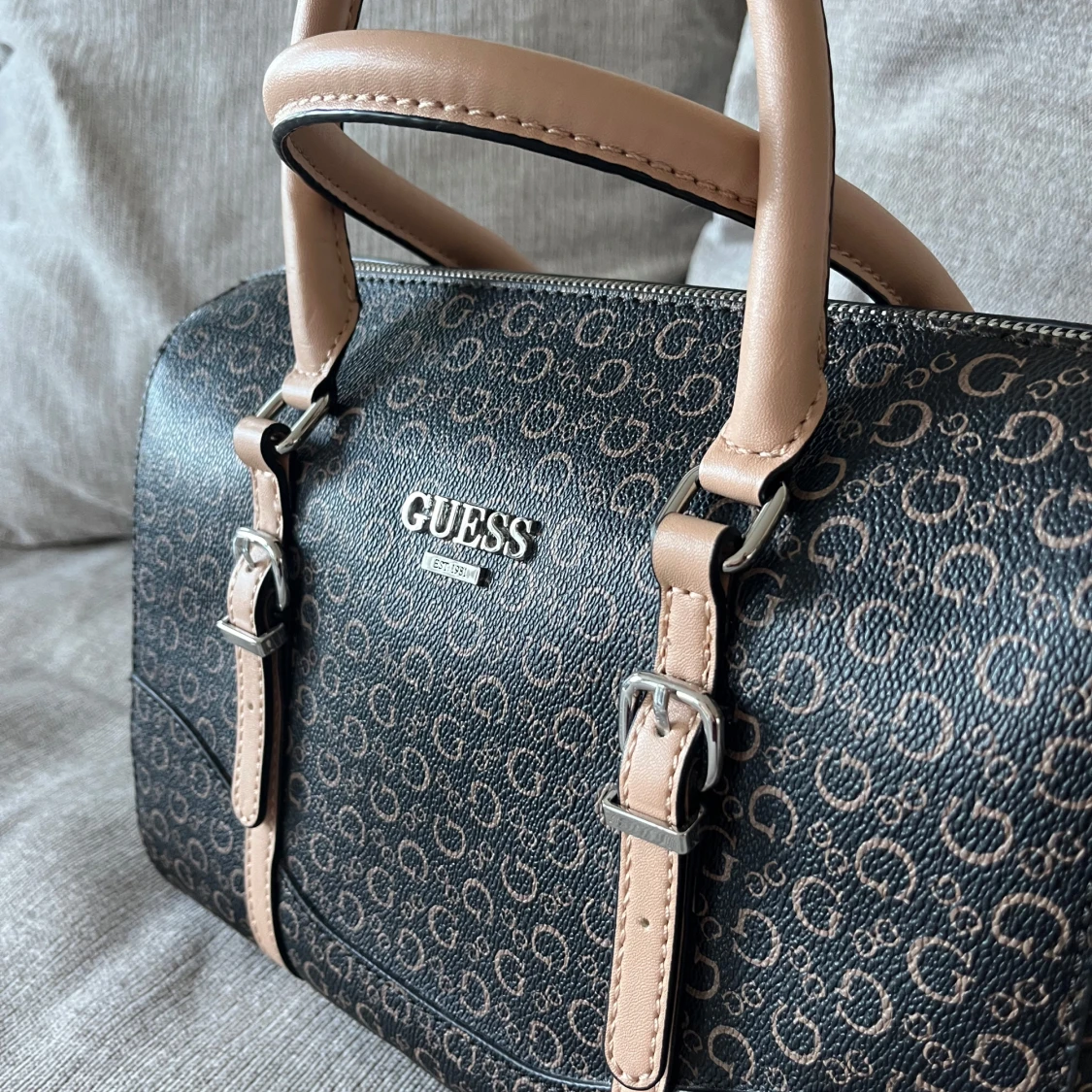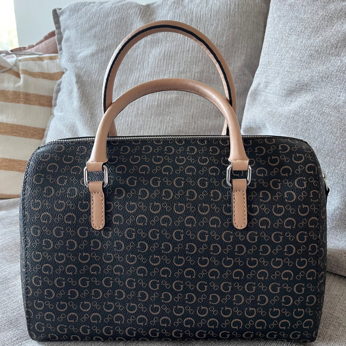 GUESS väska, monogram, i nyskick. Färgen är brun mer beige, och silvriga detaljer. Stängs med dragkedja. Skinnimitation. Mått: Längd ca 30 cm Höjd ca 21 cm Djup ca 17 cm