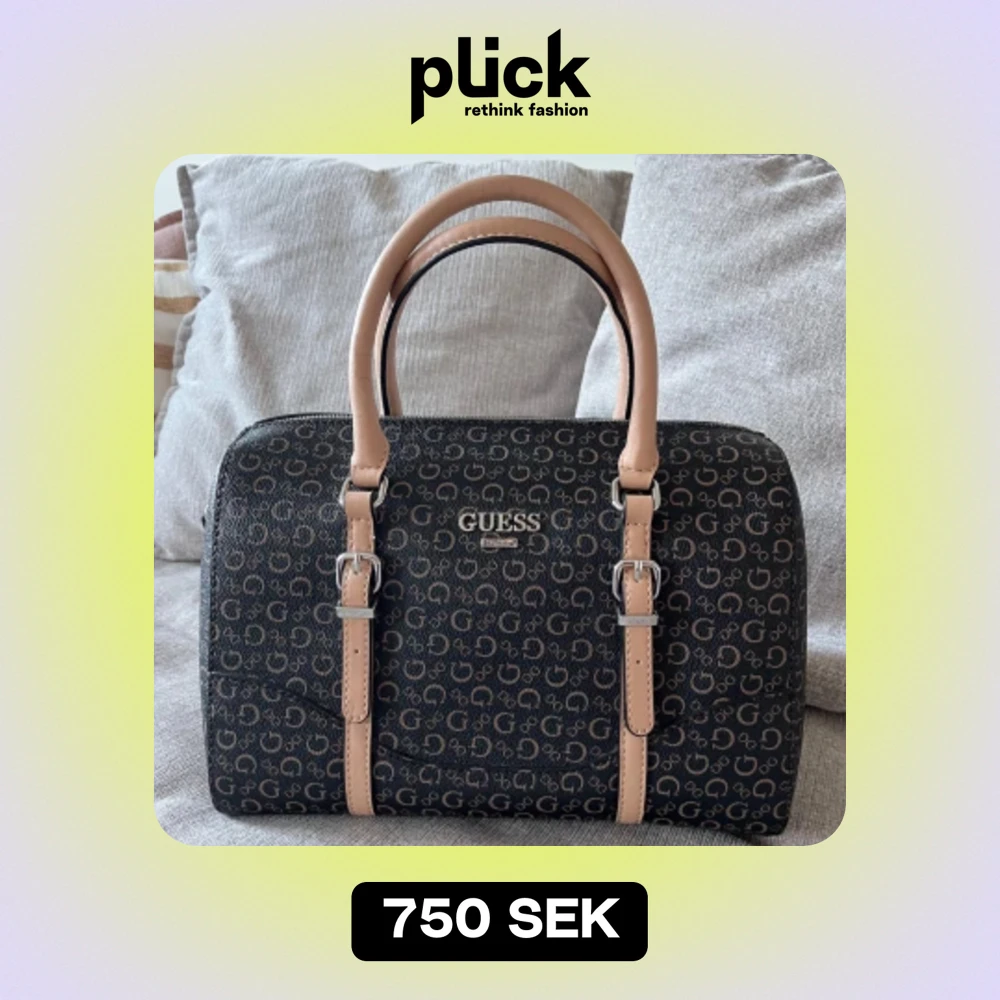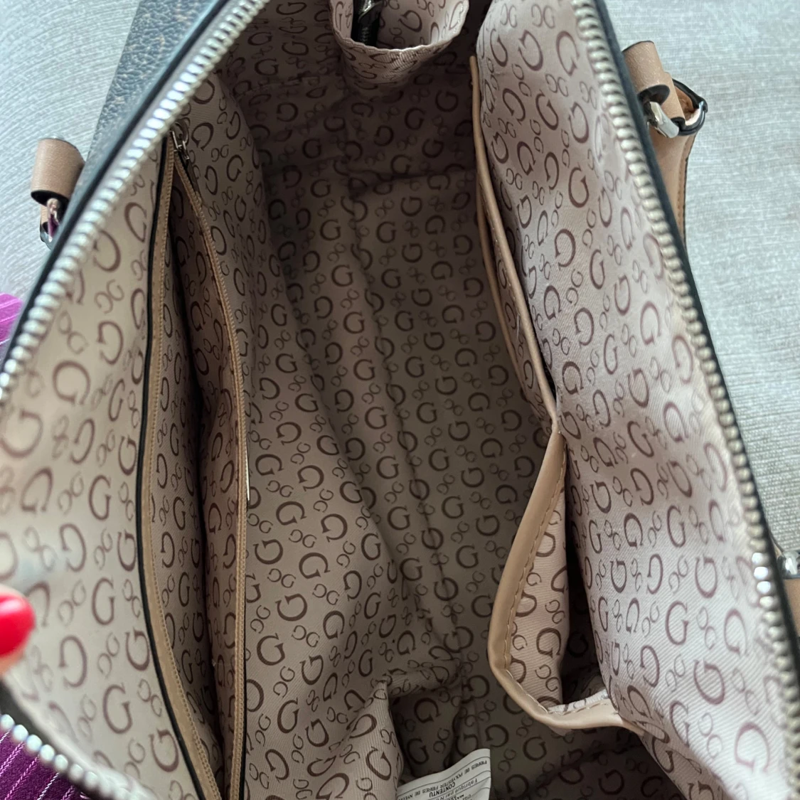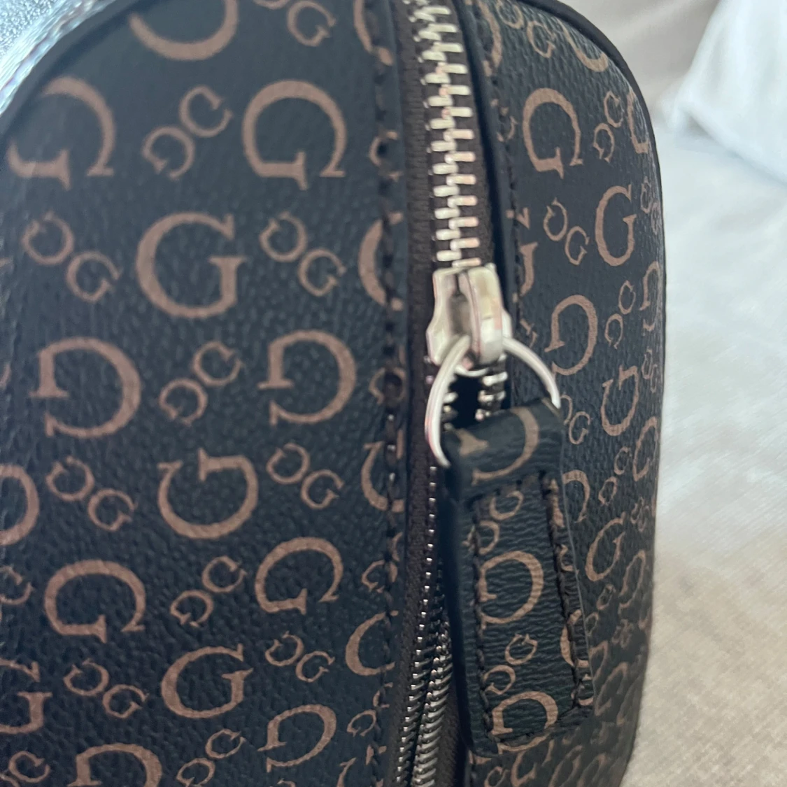 GUESS väska, monogram, i nyskick. Färgen är brun mer beige, och silvriga detaljer. Stängs med dragkedja. Skinnimitation. Mått: Längd ca 30 cm Höjd ca 21 cm Djup ca 17 cm