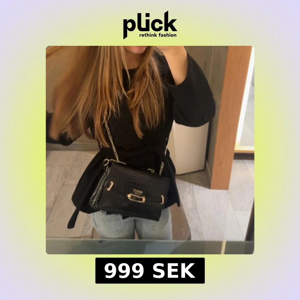 Säljer en svart axelväska från Guess med croco-mönstrad yta och snygga guldfärgade detaljer. Väskan har en kedjerem som ger en lyxig känsla och ett stilrent metallspänne framtill. Perfekt storlek för det viktigaste och passar till många outfits. Nypris 1700kr