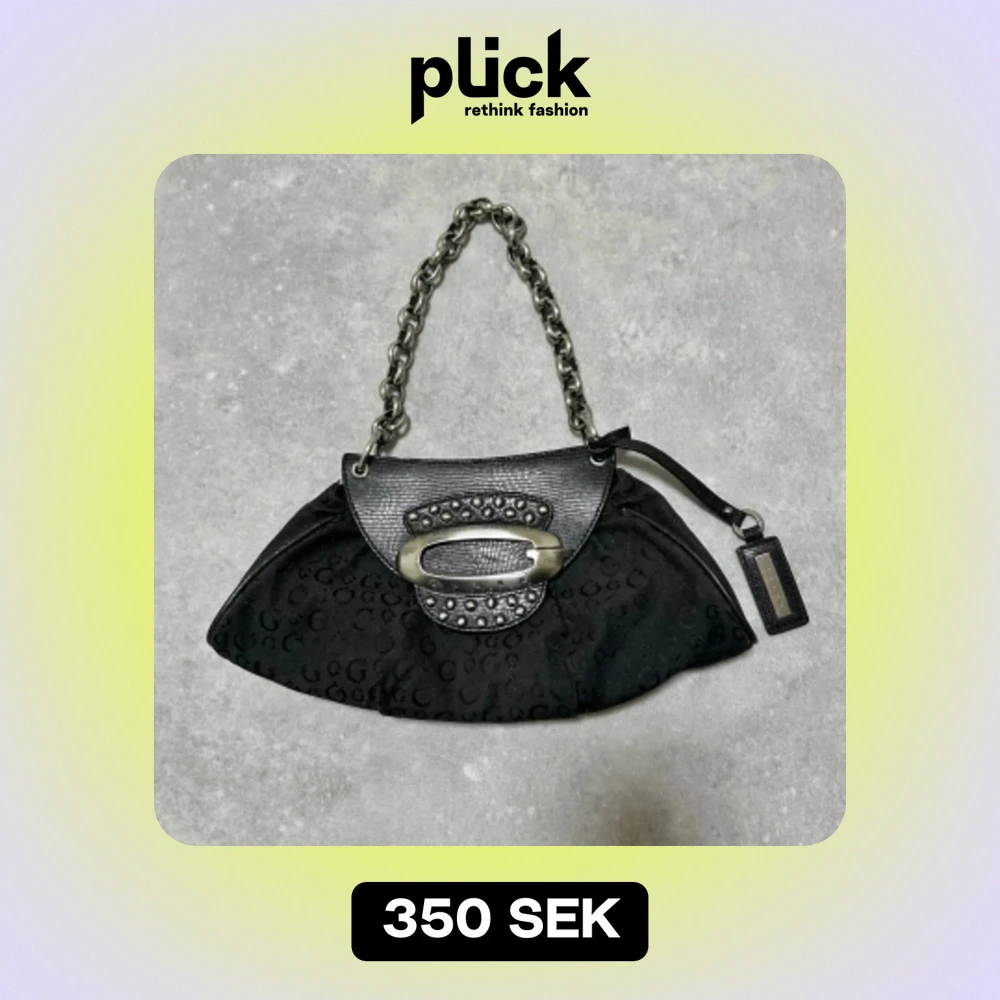 Fin vintage guess väska från 2000s. Silver kedja och detaljer. Läder på utsidan, tyg material på insidan och utsidan. Mått: 35 cm x 15 cm