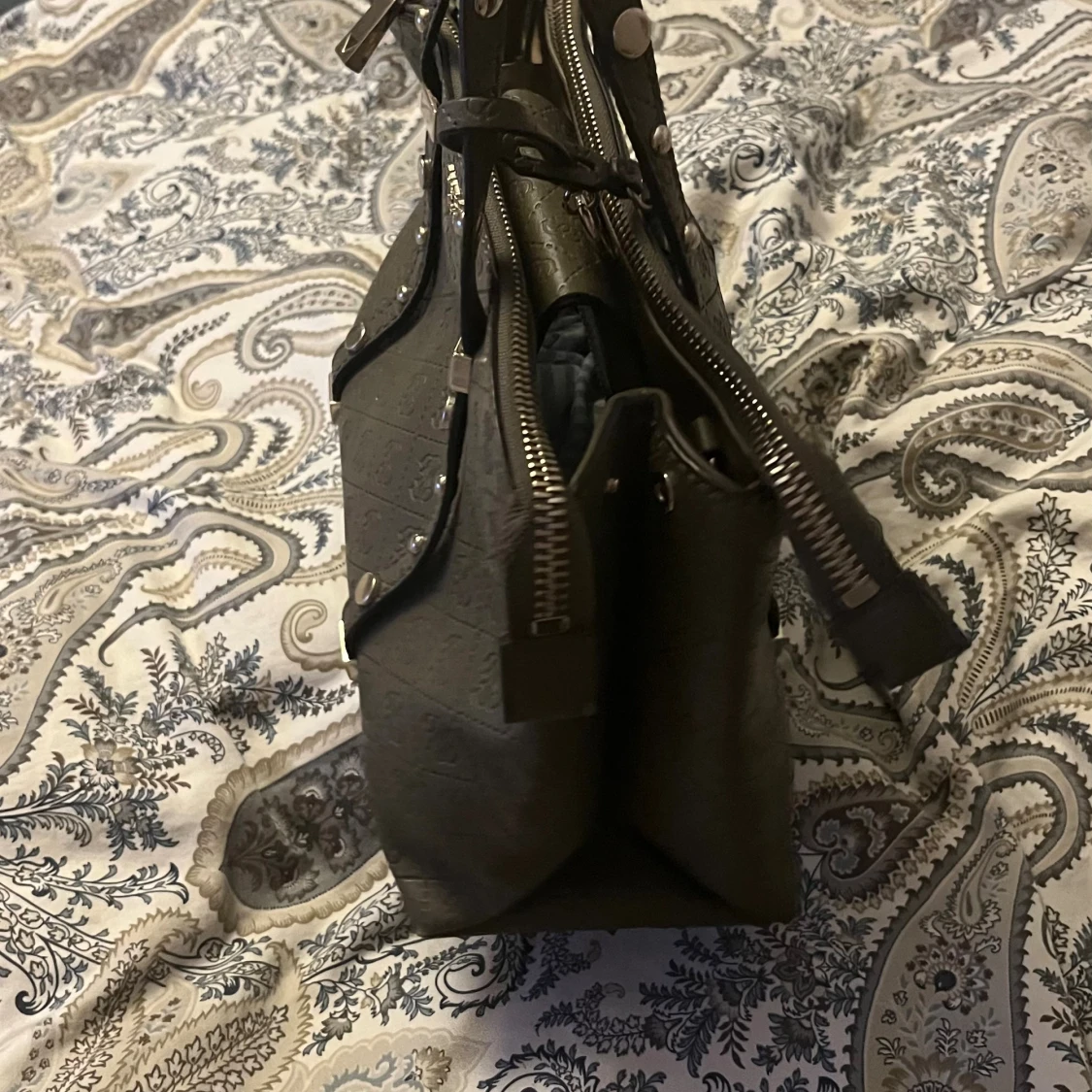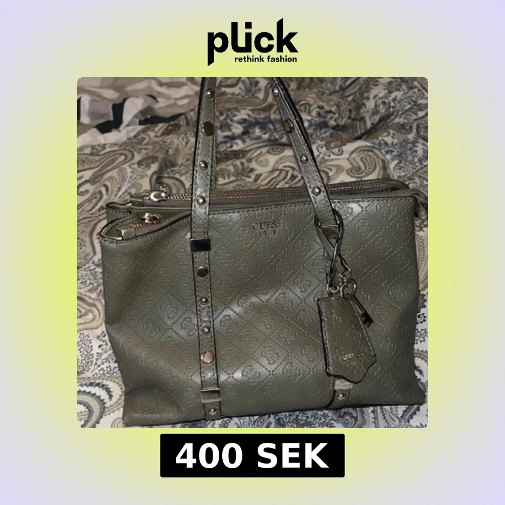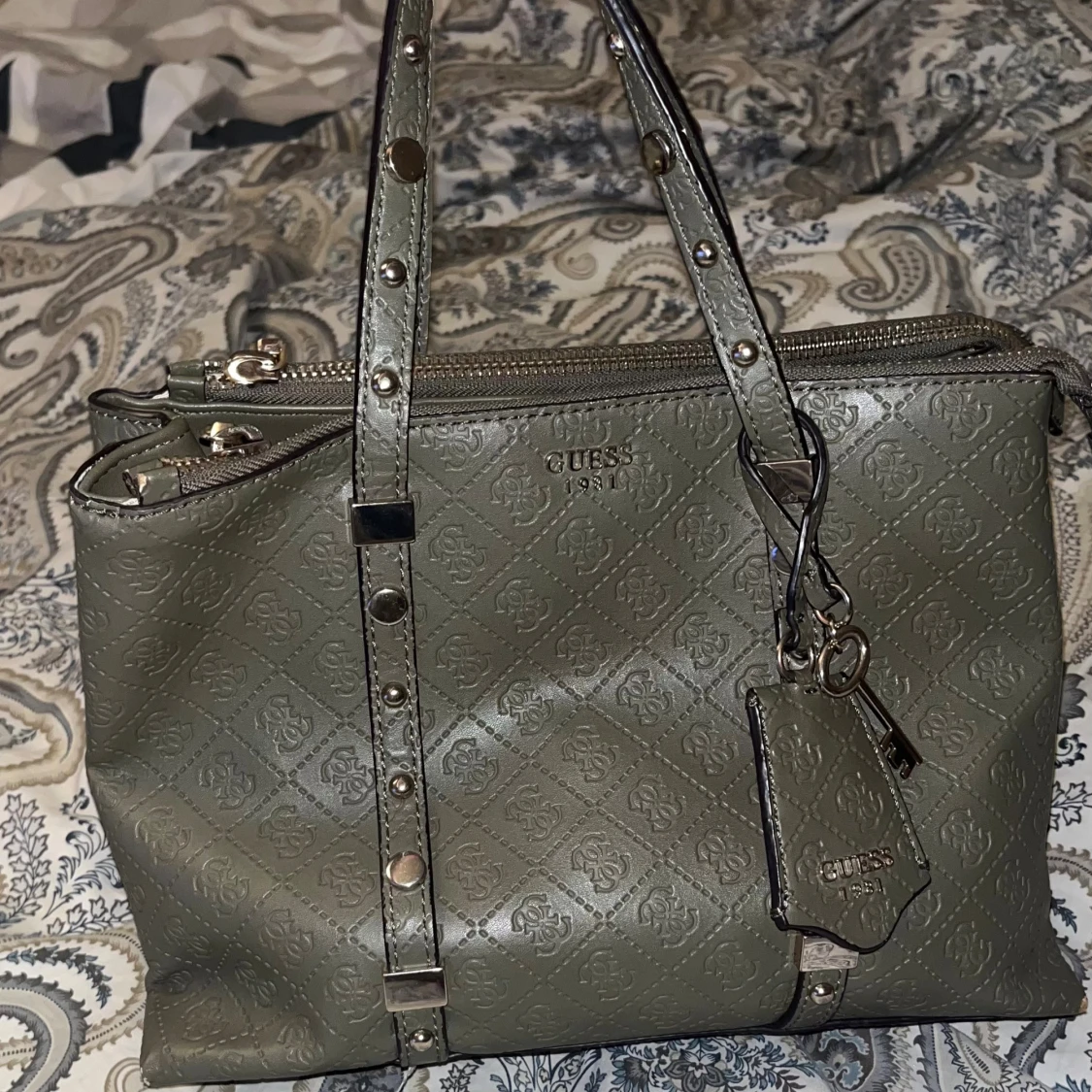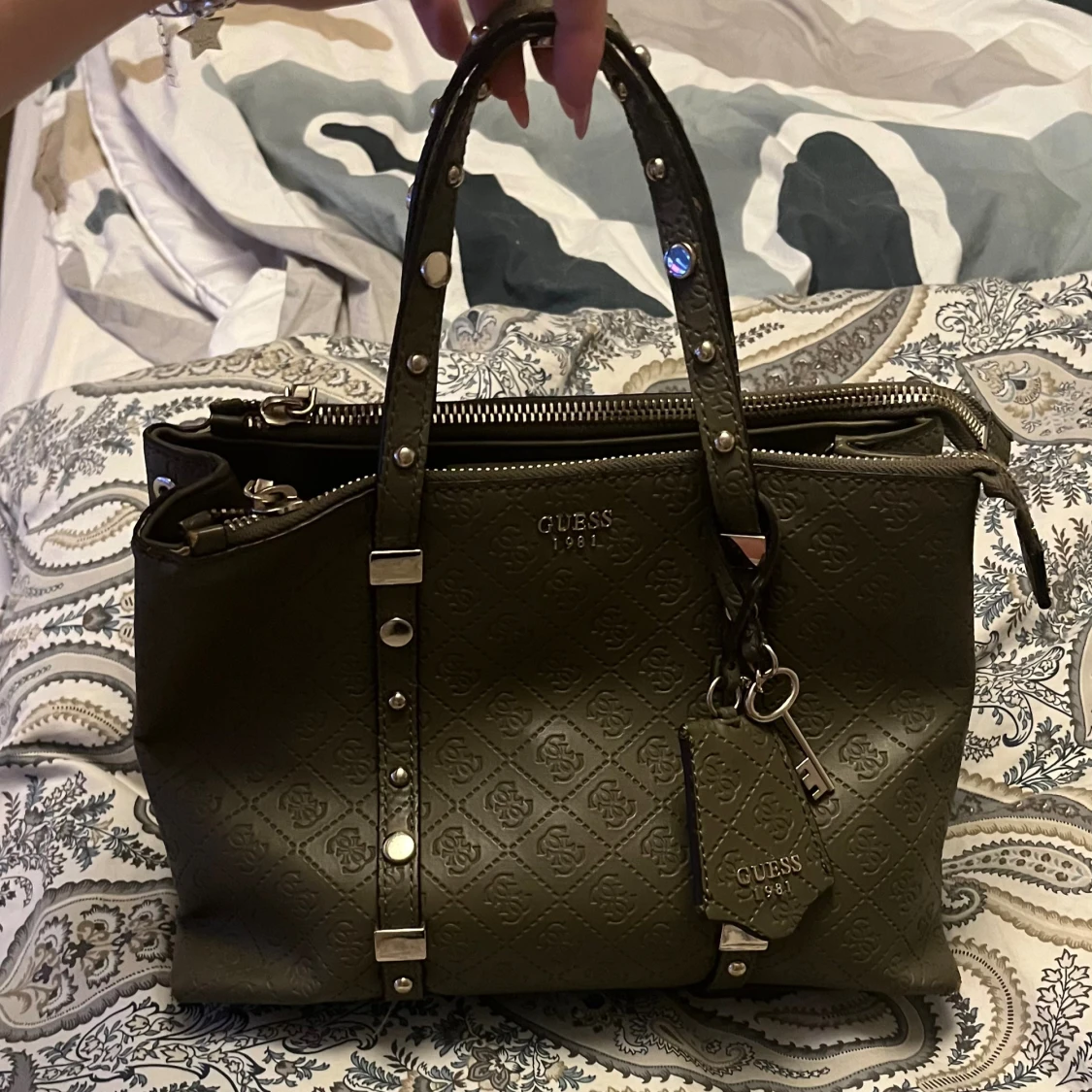 Snygg grön handväska från Guess med präglat logomönster och silverfärgade nitar på handtagen. Väskan har dubbla dragkedjor, dekorativ nyckel och tag, samt flera fack inuti för smart organisering. Tillverkad i skinnimitation med stilren look. Vet ej om den är äkta