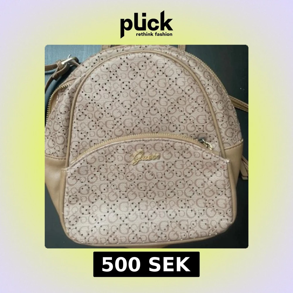 Snygg ryggsäck från Guess i beige latte-nyans med all-over logomönster och guldfärgade detaljer. Väskan har rundad form, dragkedja och ytterfack framtill. Materialet är syntet med läderlook och insidan har logotypdetaljer. Perfekt för dig som vill ha en trendig och praktisk väska.