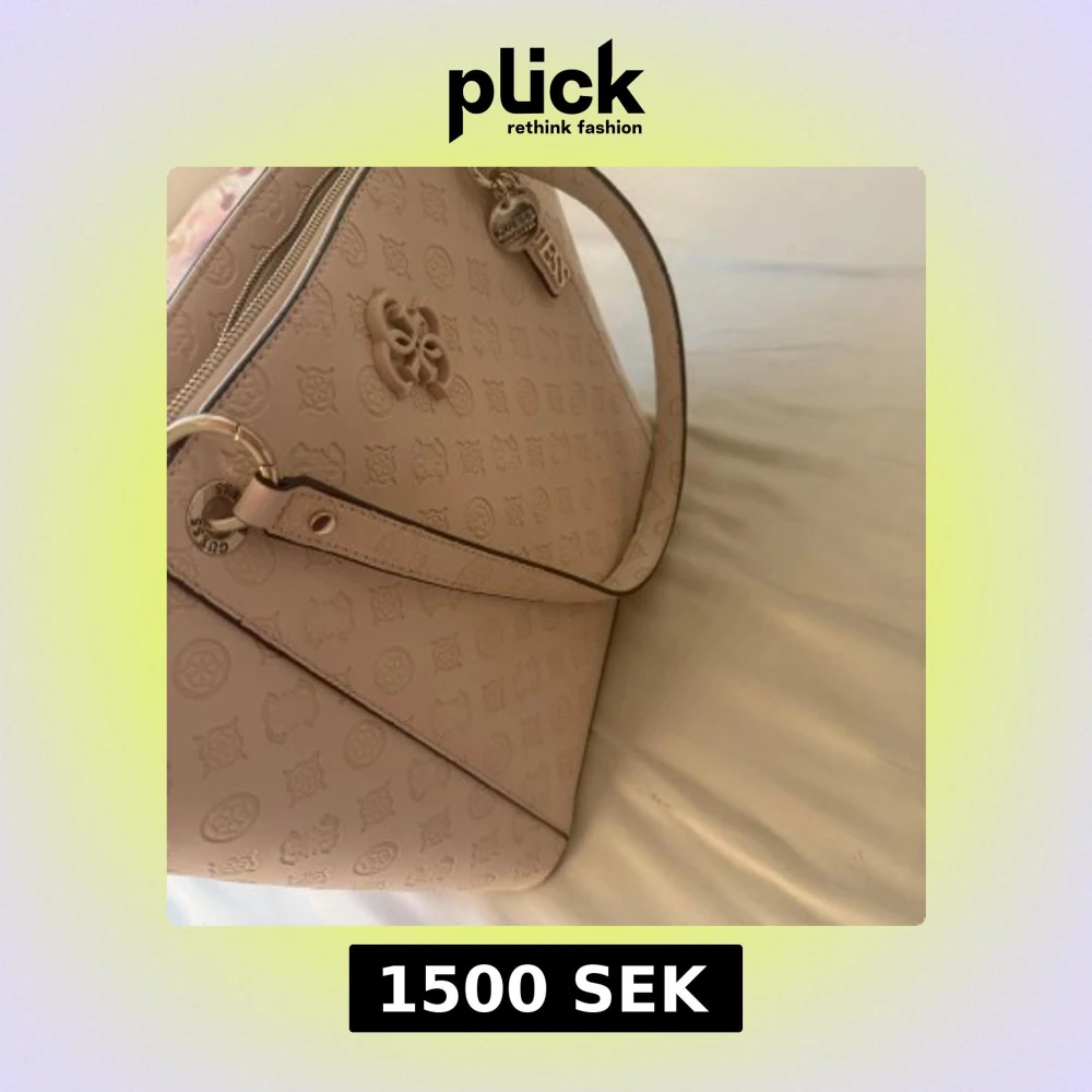 Säljer en stilren ljusrosa/beige handväska från Guess helt ny med präglat logomönster och silverfärgade detaljer. Väskan har dragkedja upptill, ett ytterfack med dragkedja och ett handtag. Perfekt jobbväska eller resväska får plats med otroligt mycket,
