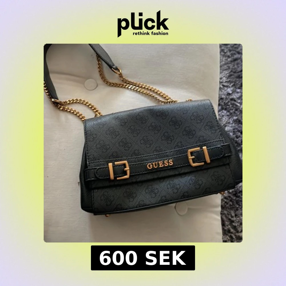 Snygg svart axelväska från Guess med guldfärgade kedjor och detaljer. Väskan har präglat logomönster, två dekorativa spännen framtill och Guess-logga i guld. Insidan är ljus med flera fack och dragkedja. Perfekt storlek för det viktigaste. nyskick aldrig använd