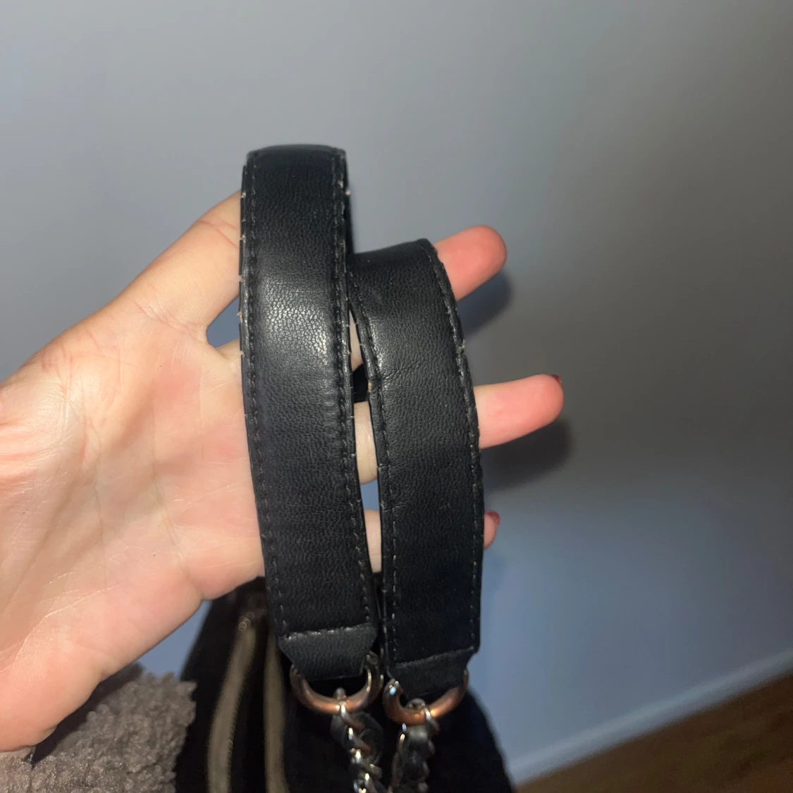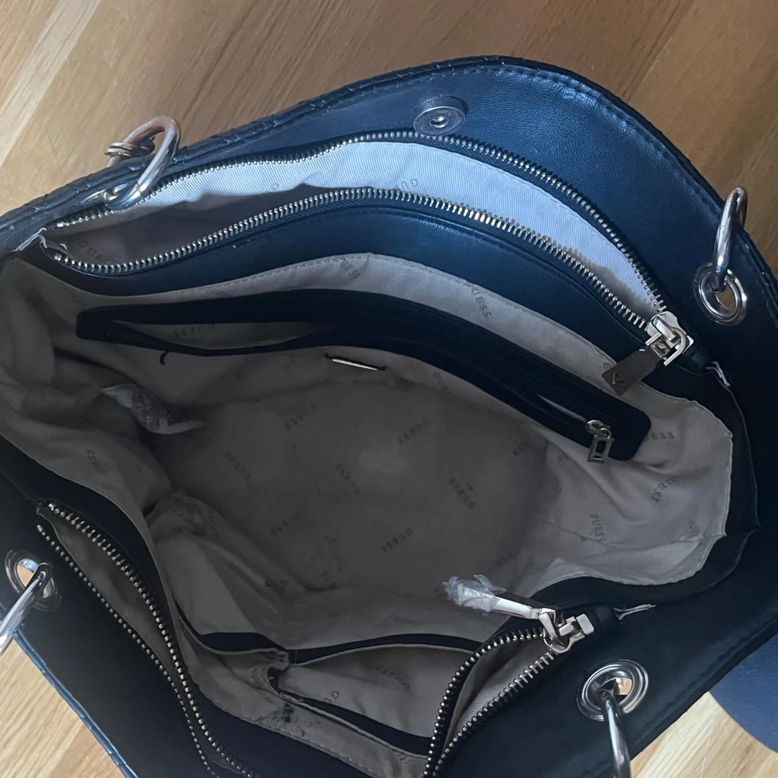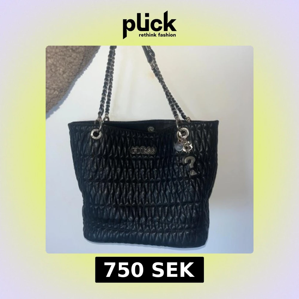 Snygg svart quiltad axelväska från Guess med kedjedetaljer på remmarna. Väskan har flera fack med dragkedja och en stilren logga framtill. #guess #vintage pris kan diskuteras