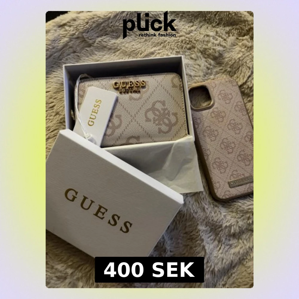 Snygg beigerosa plånbok från Guess med klassiskt logomönster och guldfärgade detaljer. Plånboken har dragkedja runtom, flera fack för kort och myntfack med dragkedja. Tillverkad i tåligt syntetmaterial och levereras i originalask. Plånboken är använd 2 tillfällen men enbart legat i väska , mobilskalet passar en iPhone 14/15 plus kan finnas nån liten skavank på skalet då det är använt