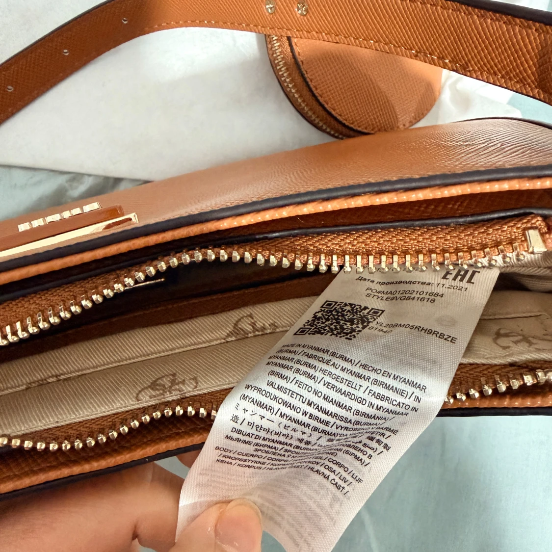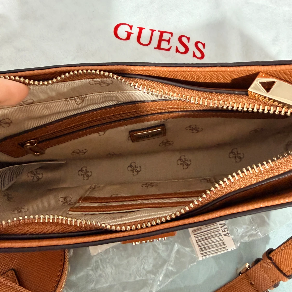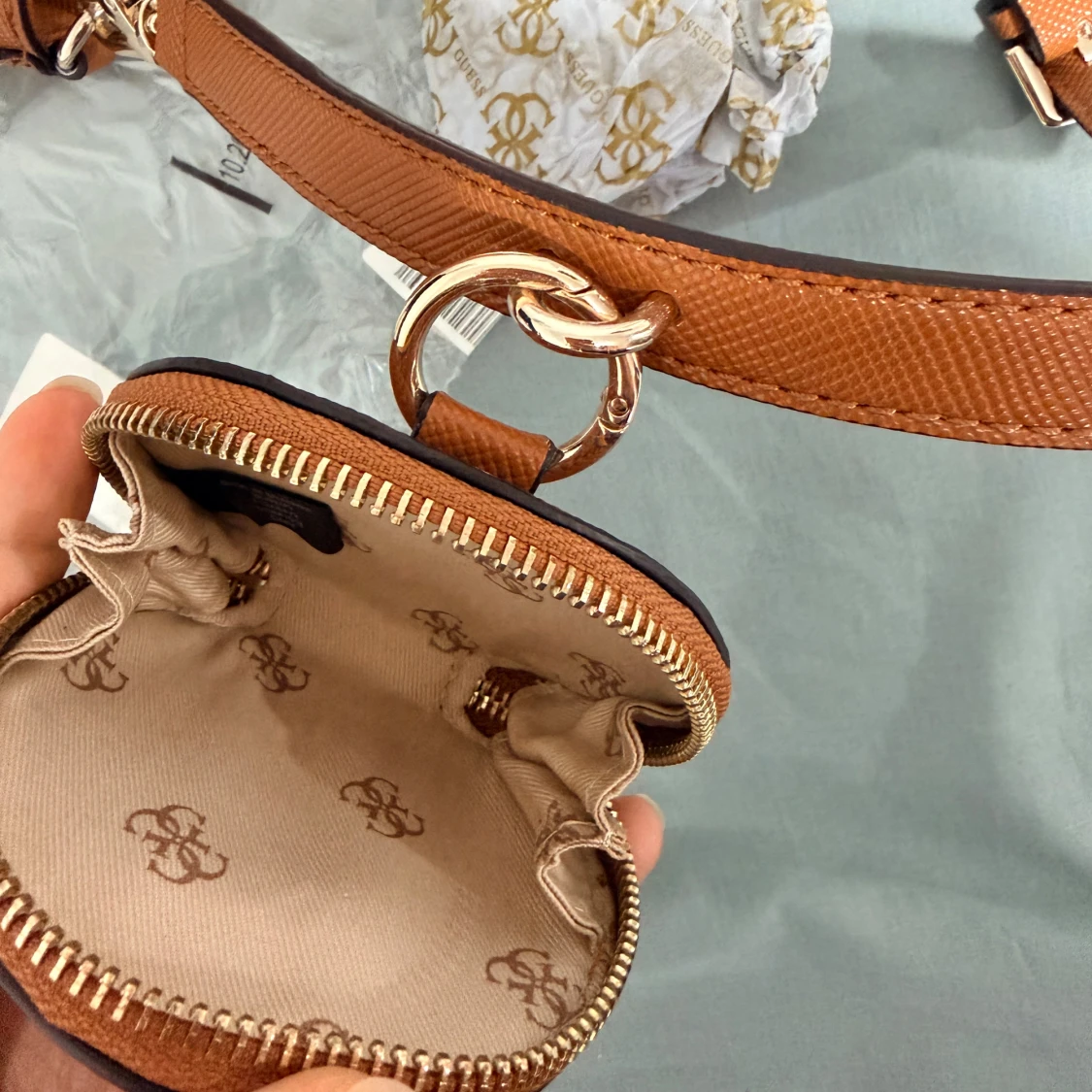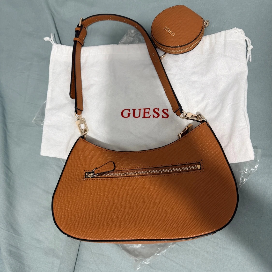 Snygg brun axelväska från Guess med klassisk trekantig logga framtill. Väskan har justerbar axelrem, matchande rund liten väska och guldfärgade detaljer. Utsidan är i strukturerat syntetmaterial och insidan har flera fack med dragkedja.