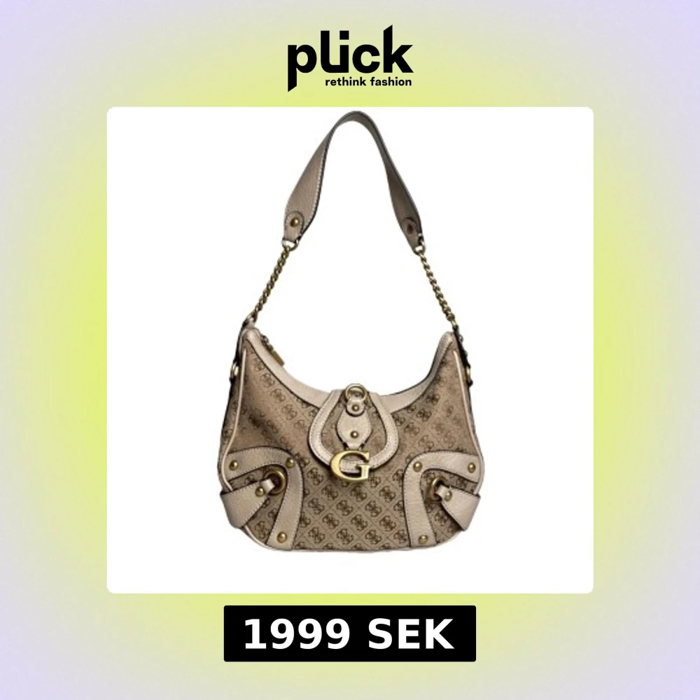 Jävligt snygg beige vintage axelväska från Guesse. Väskan har detaljer i ljusbeige skinn, guldfärgade metalldetaljer och kedja på axelremmen. Stängs med magnetlås och har dragkedja baktill. Perfekt storlek för det allra mesta. ÄLSKAR denna väskan med hela min själ så det tar verkligen emot att sälja men den kmr komma till bättre användning hos någon annan.