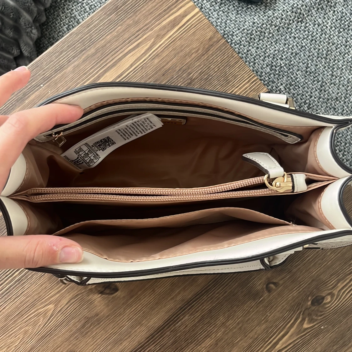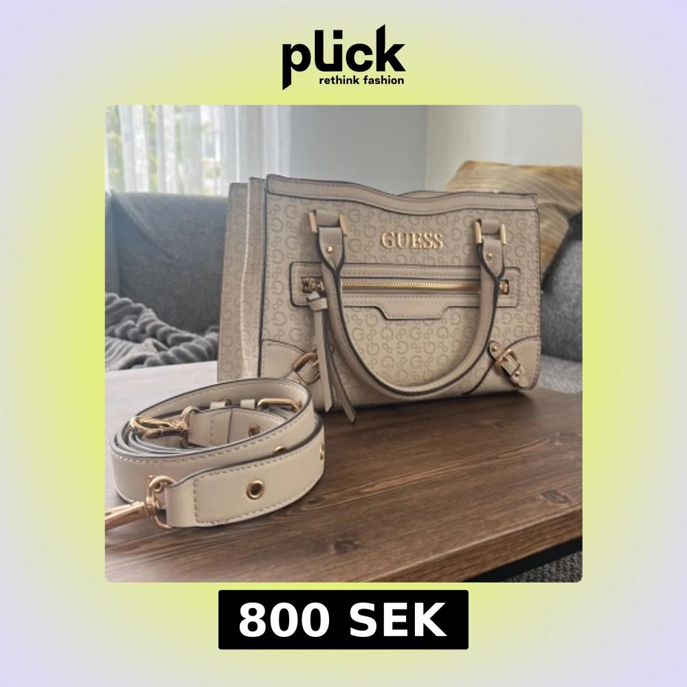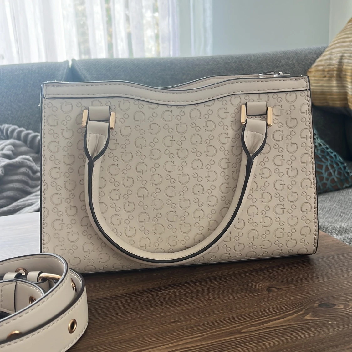 Snygg beige handväska från Guess med guldiga detaljer och präglat logomönster över hela väskan. Väskan har både handtag och avtagbar axelrem, dragkedja framtill och flera fack inuti för smart organisering. Perfekt för dig som gillar stilrena accessoarer med lyxig känsla. PRICE NEGOTIABLE