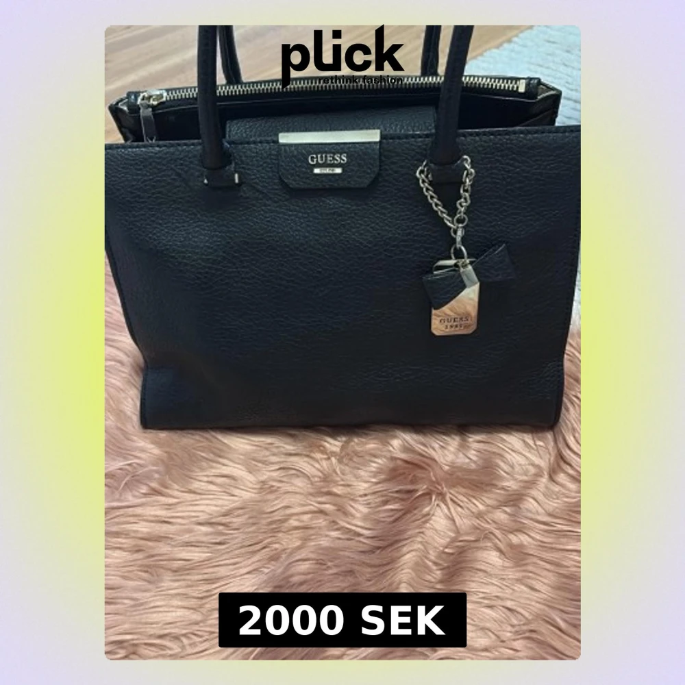 Snygg svart handväska från Guess i strukturerat skinn med silverfärgade detaljer och dekorativ kedja med logga. Väskan har flera fack inuti, dragkedja och magnetlås. Perfekt för dig som vill ha plats för allt du behöver och ändå se stilren ut.