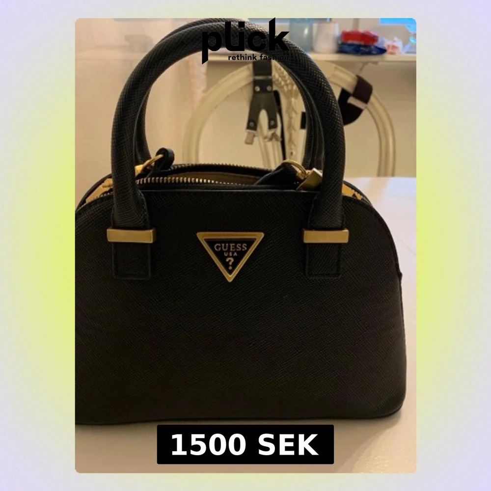 Snygg svart handväska från Guess med major gold detaljer och klassisk trekantslogga framtill. Väskan har två rejäla handtag, justerbar axelrem och dragkedja upptill. Materialet är strukturerat syntet som ger en exklusiv känsla. Helt ny Guess handväska. Tillkommer dustbag Passform: Höjd: 18,5 cm i storlek one size Längd: 27 cm i storlek one size Vidd: 29,5 cm i storlek one size.