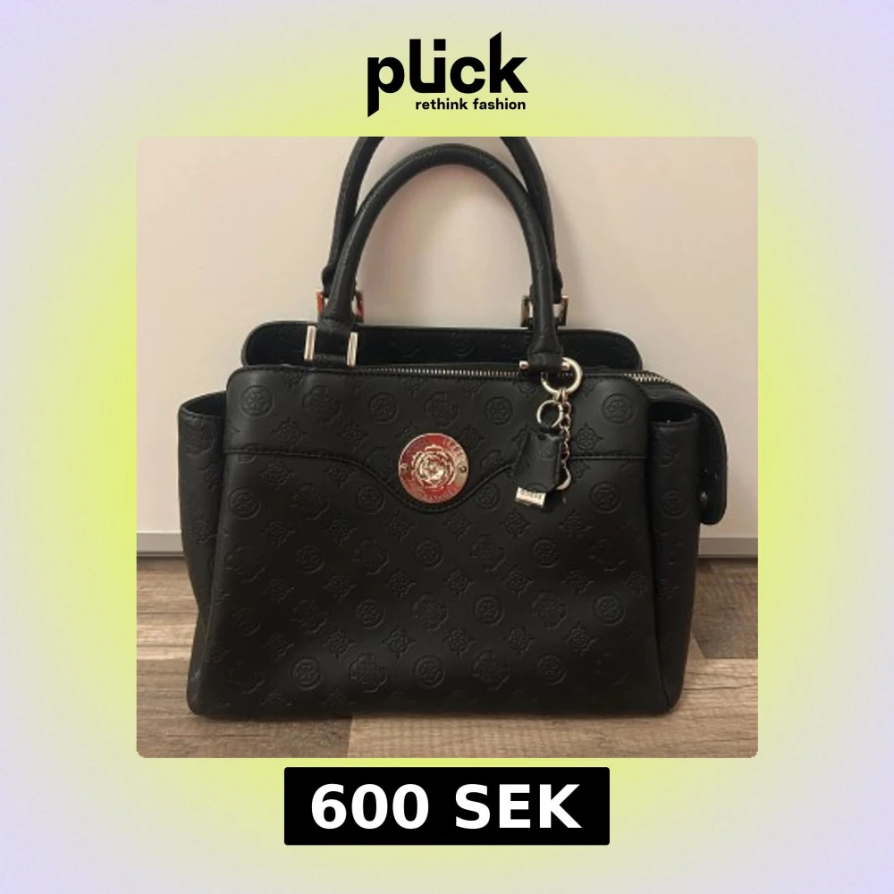Svart handväska från Guess med präglat mönster och guldfärgade detaljer. Väskan har dubbla handtag, dragkedja upptill, ytterfack med dragkedja och flera innerfack. Axelband medföljer till väskan. Se sista bilden för ytterst liten defekt som inte påverkar dess funktion. Väskan är i sin helhet i fint skick.