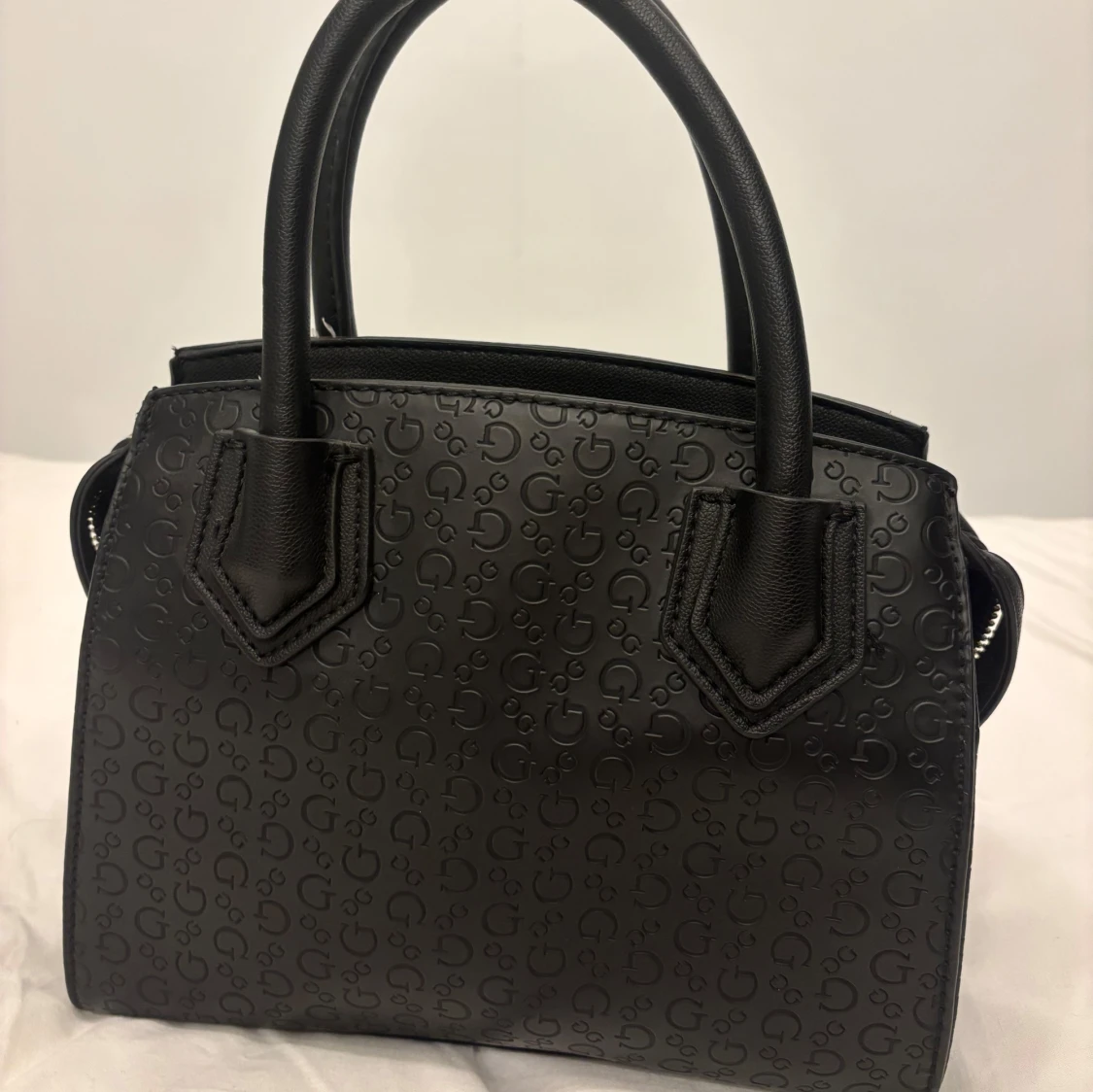 Snygg svart handväska i skinn med monogrammönster. Den har både handtag och en avtagbar axelrem för flexibilitet. Väskan har en dragkedja upptill och ett ljust innerfoder med samma monogramdesign. Perfekt för både vardag och fest!