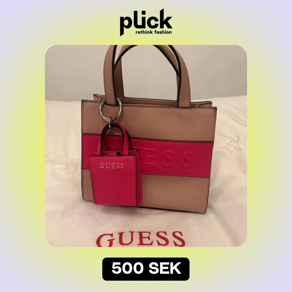 Säljer en superfin handväska från Guess i beige och rosa. Helt oanvänd! Väskan har en avtagbar axelrem och en liten matchande mini-väska. Perfekt för både vardag och fest! Den har en praktisk dragkedja inuti för säker förvaring.