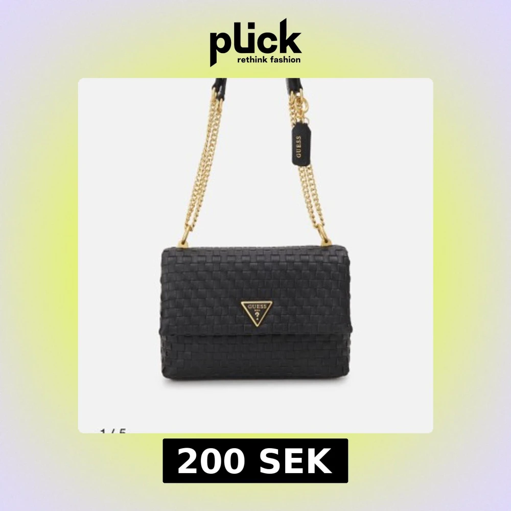 Snygg svart axelväska från Guess med flätat mönster och guldfärgade kedjedetaljer.