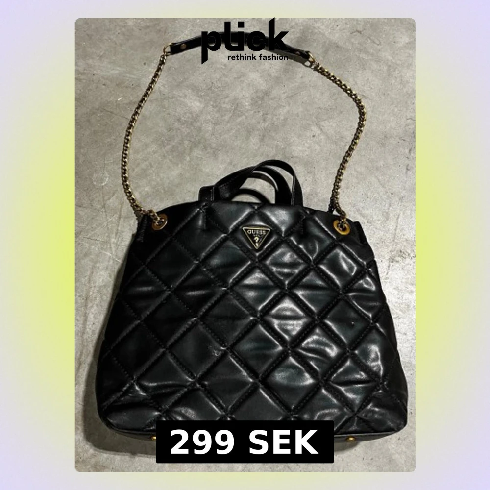 Säljer en svart handväska från Guess med quiltad design och guldfärgade detaljer. Väskan har både kedjeaxelrem och handtag, samt flera fack med dragkedja inuti och utanpå, även ytterligare en mindre väska kopplad innanför. Materialet är skinn och insidan är fodrad med mönstrat tyg. Perfekt för dig som gillar stilrena accessoarer.