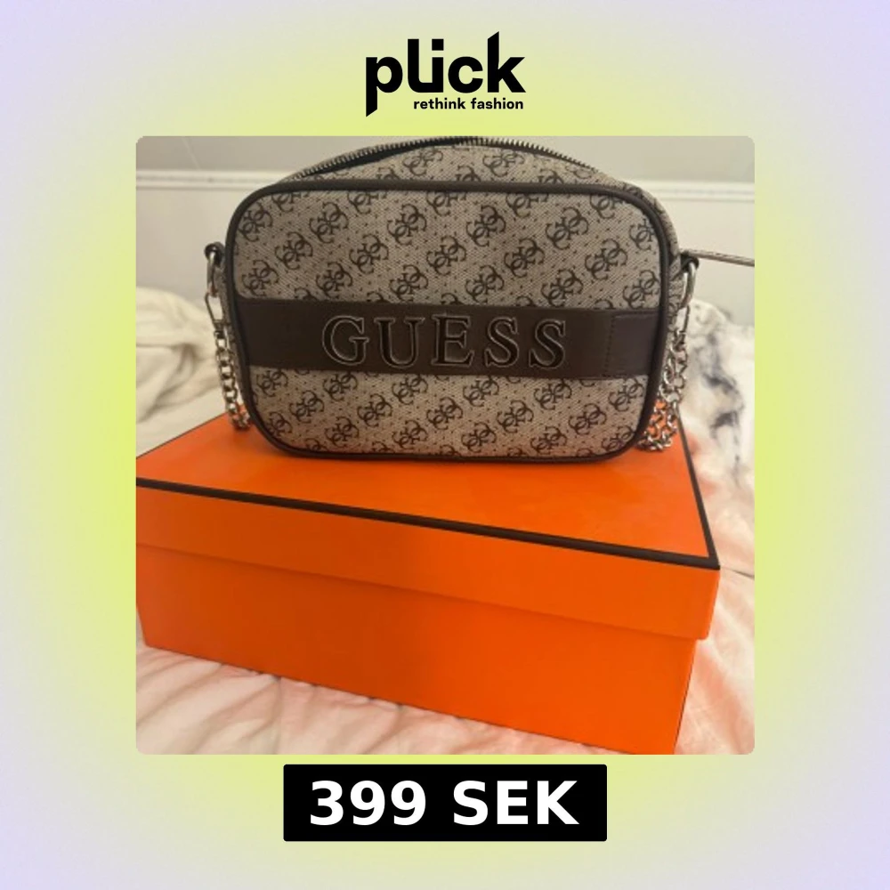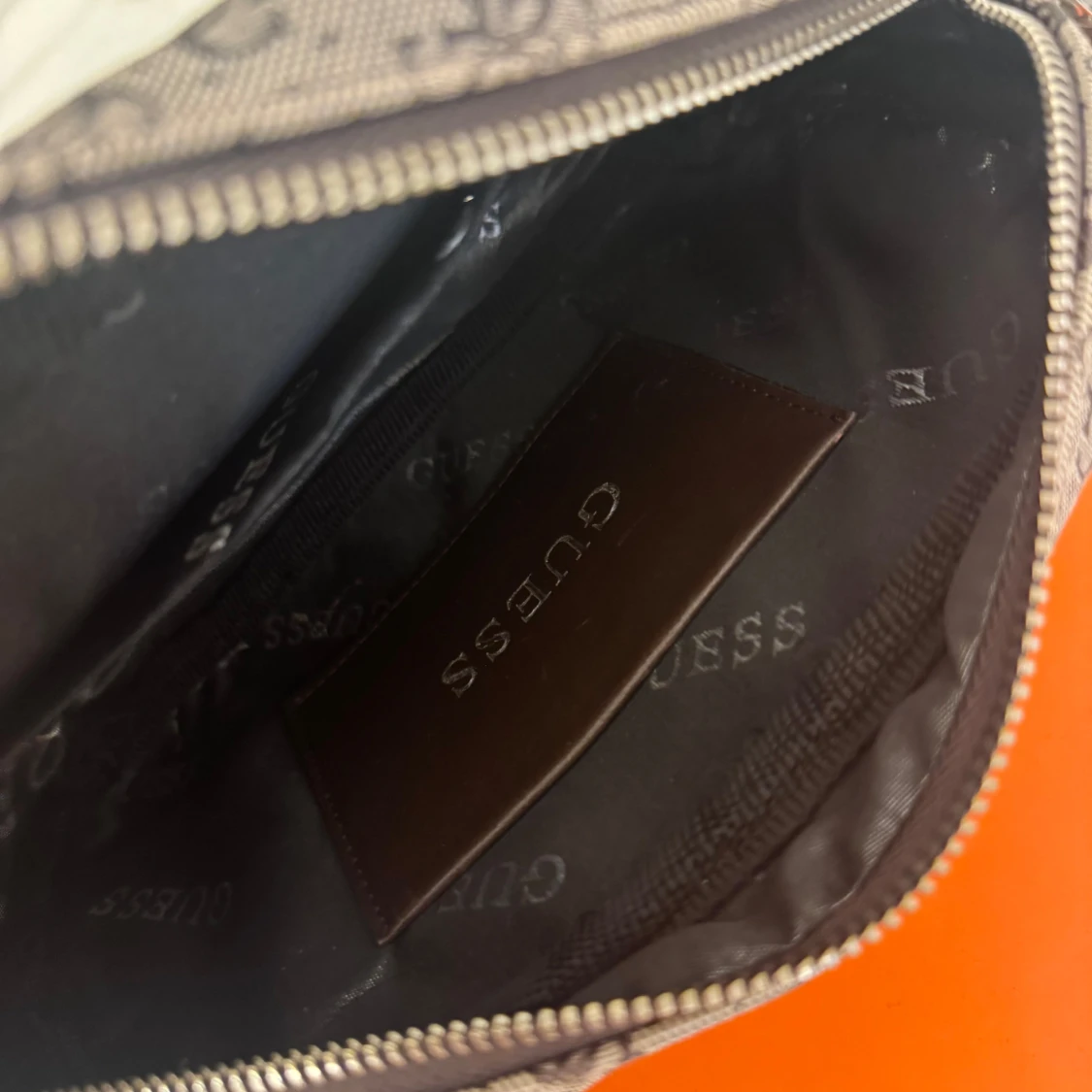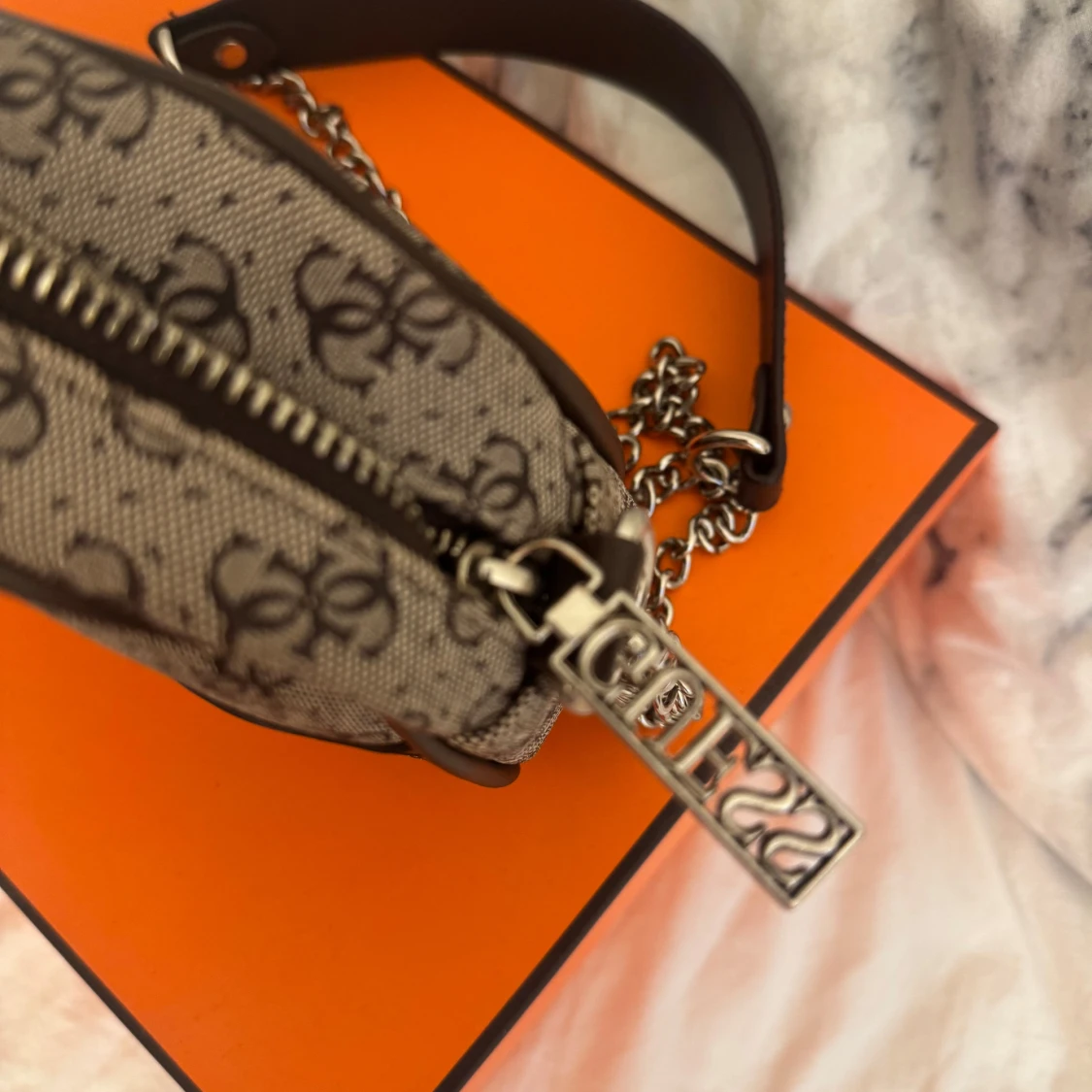 Snygg beige axelväska från Guess med tydligt logomönster och bred svart detalj med stor GUESS-text framtill. Väskan har silverfärgad kedjerem och dragkedja med Guess-logga. Perfekt storlek för det viktigaste och stilren insida med Guess-tryck.