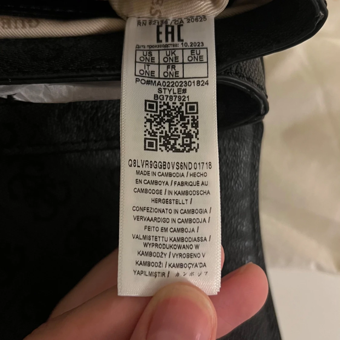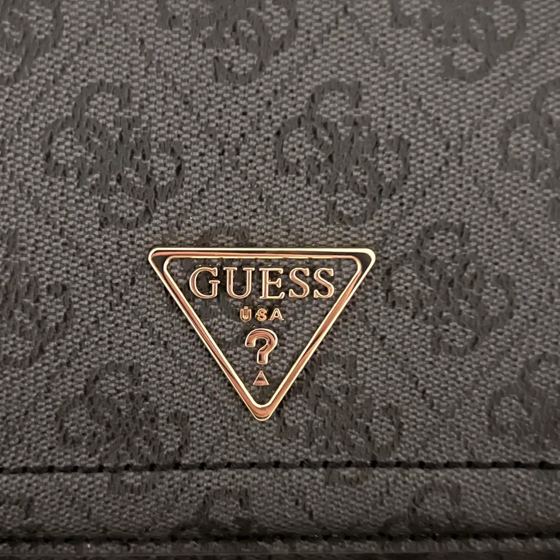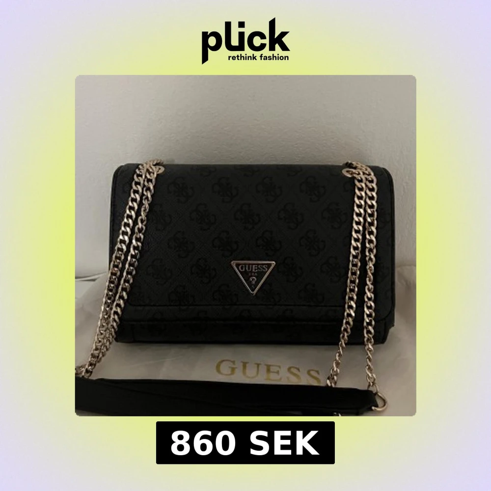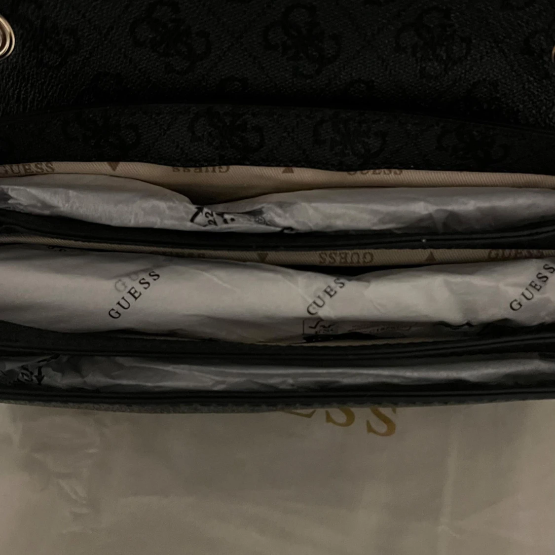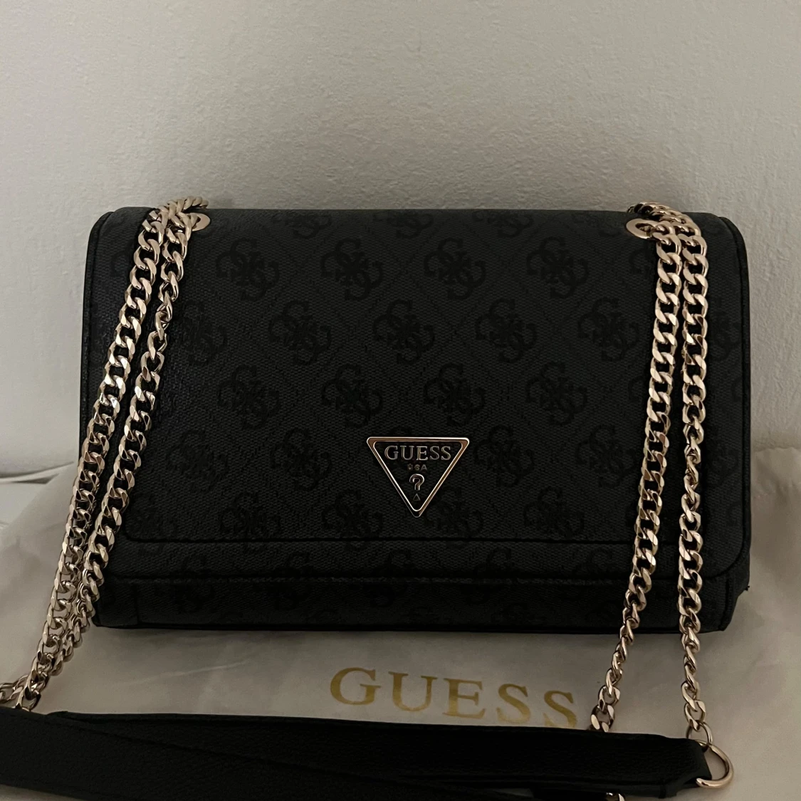 Snygg svart axelväska från Guess med diskret mönster och guldfärgad kedja som axelrem. Väskan har ett klassiskt trekantsformat Guess-emblem framtill och flera fack inuti för smart organisering. Materialet är slitstark syntet med lyxig känsla. OBS väskan är original och aldrig använd.