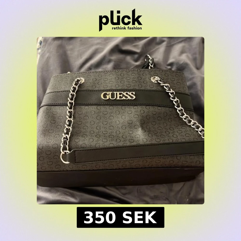 Säljer en svart axelväska från Guess med silverfärgad kedjerem och logotyp framtill. Väskan har präglat mönster med små G:n, flera fack inuti och stängs med magnetknapp. Perfekt för dig som vill ha en stilren och rymlig väska.