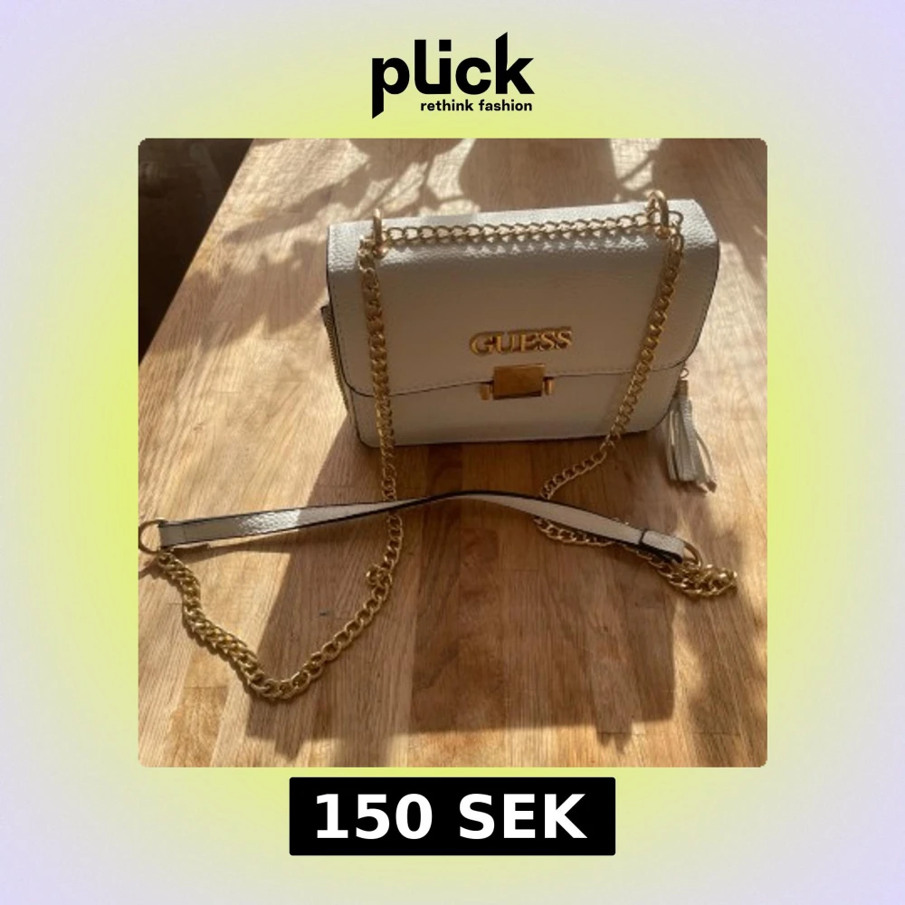 Säljer en stilren vit axelväska från Guess med guldfärgad kedja och logga framtill. Väskan har en strukturerad yta, dekorativ tofs och ett elegant spänne. Perfekt för dig som vill ha en snygg accessoar med lyxig känsla.