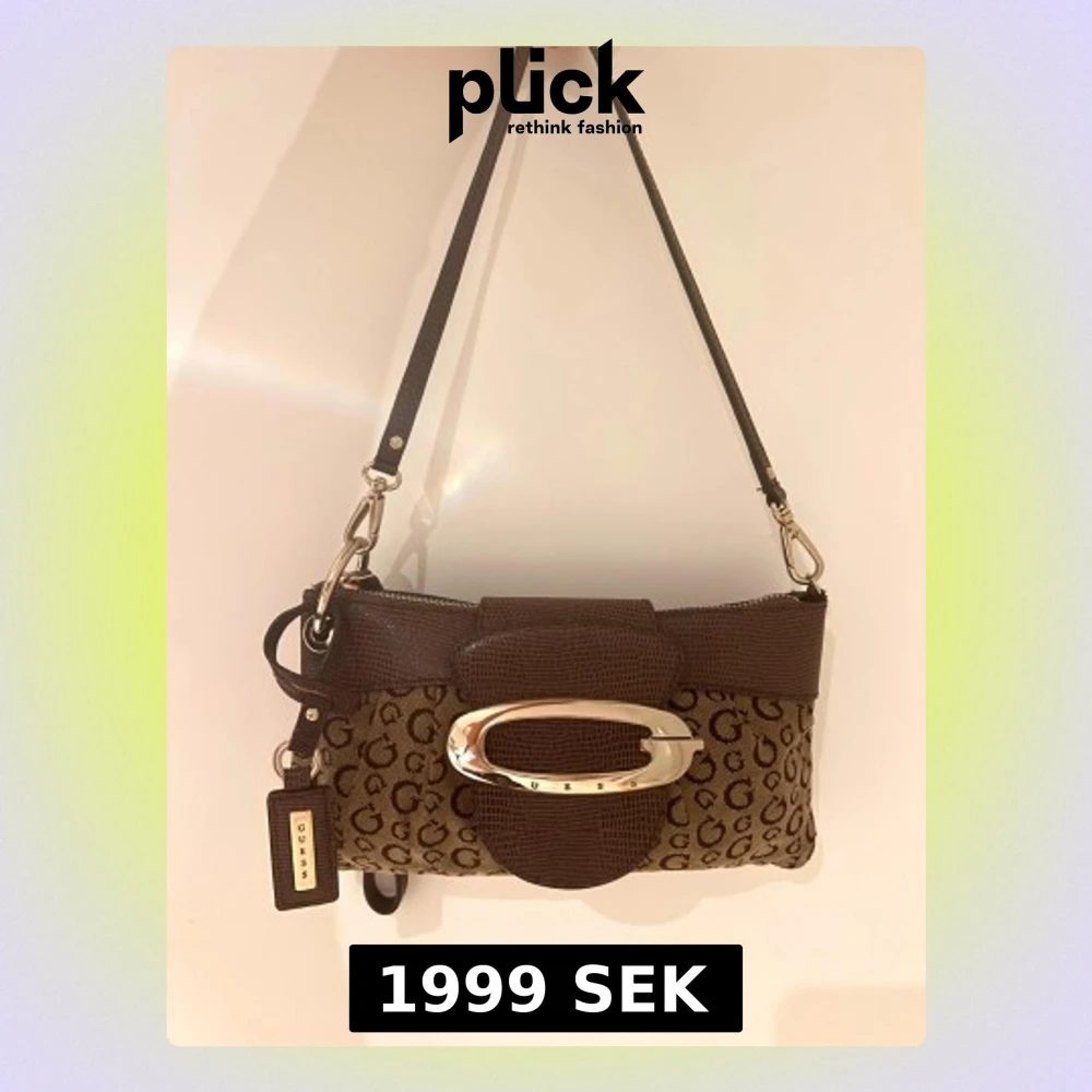 Snygg brun axelväska från Guess med klassiskt G-mönster över hela väskan. Väskan har detaljer i mörkbrunt skinnliknande material, silverfärgat spänne framtill och dragkedja upptill. Insidan har fack och en mindre ficka med dragkedja. Perfekt storlek för det viktigaste.