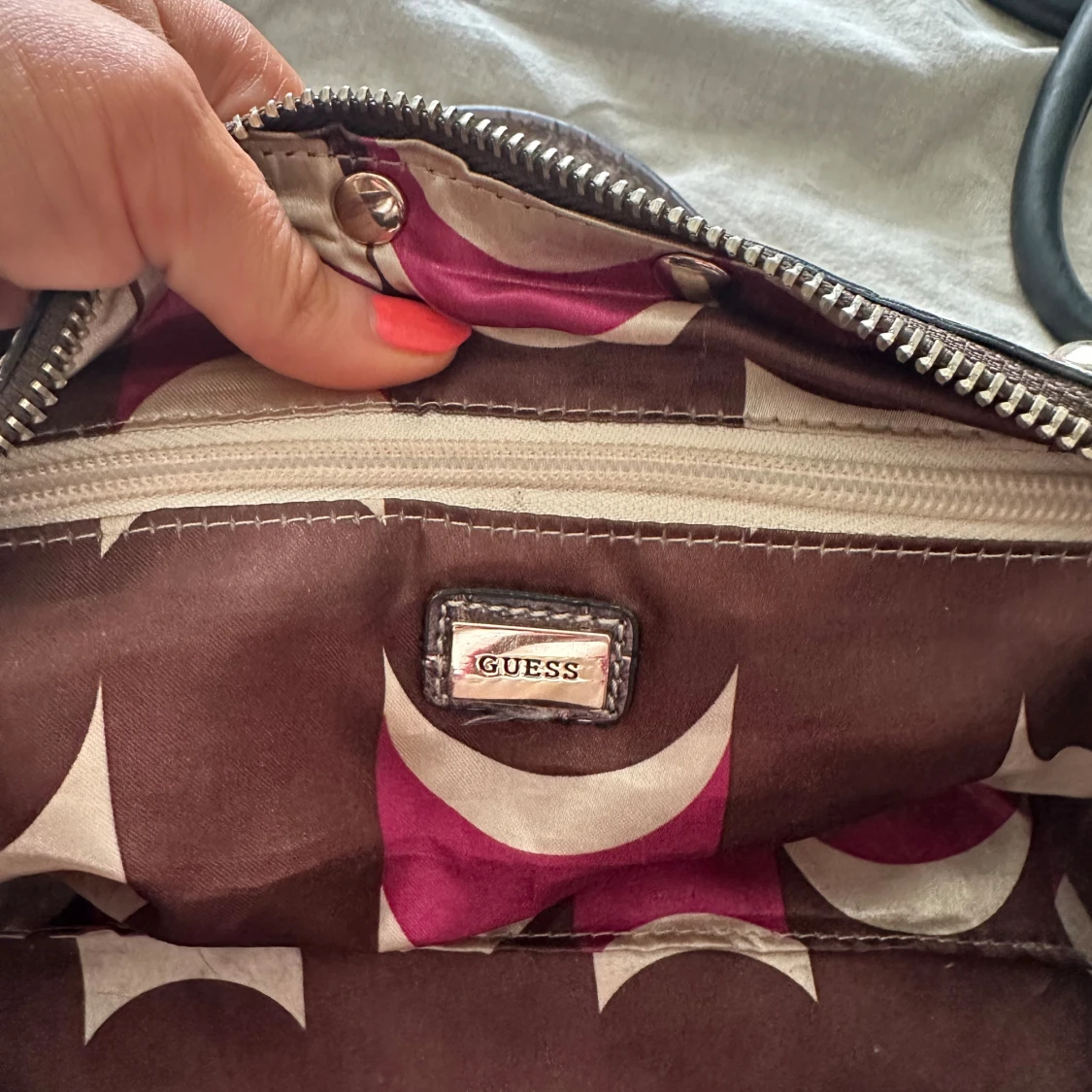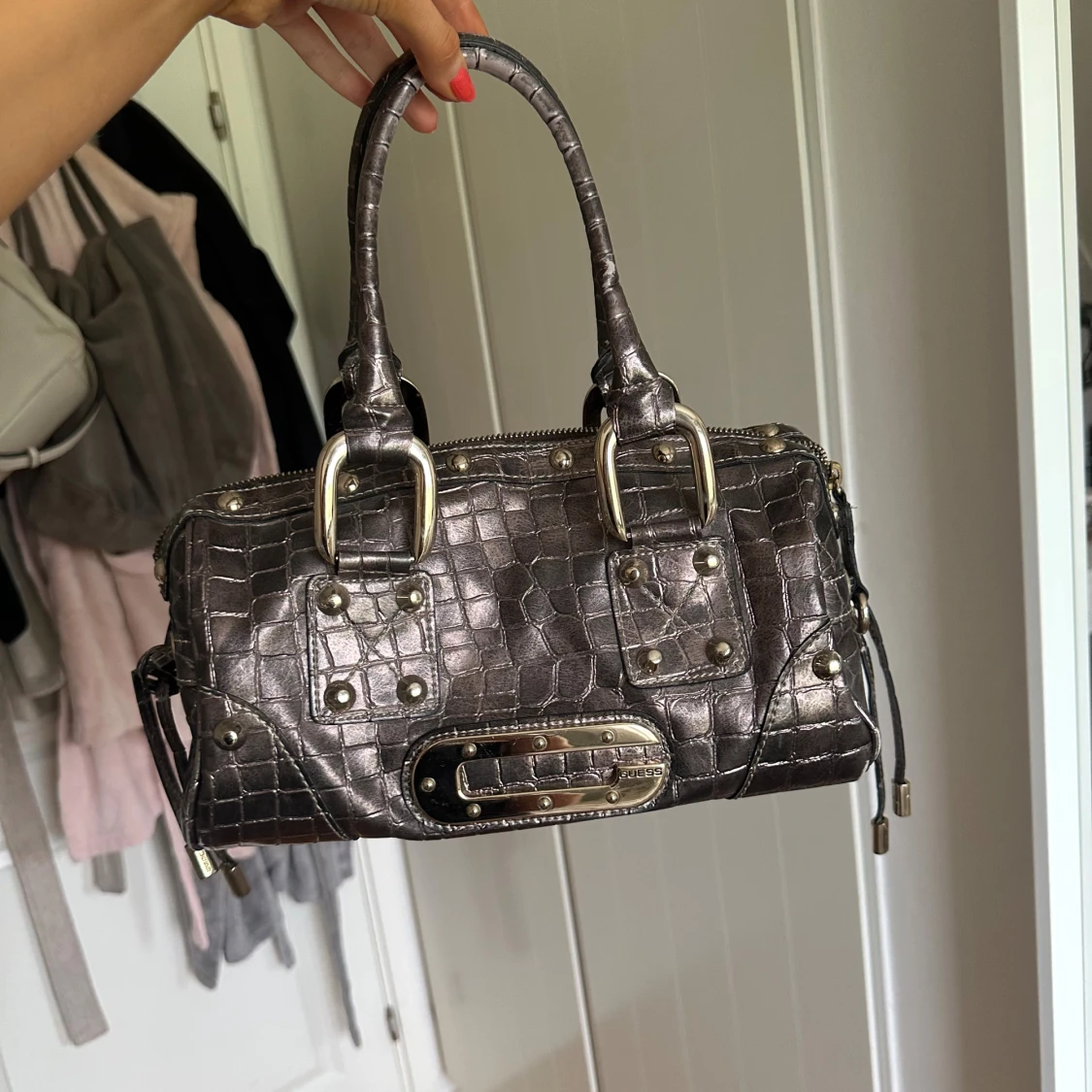 Säljer en metallic-silver handväska från Guess med crocomönstrad yta och coola nitar. Väskan har två rejäla handtag, dragkedja upptill och snygga metalldetaljer. Insidan är fodrad med mönstrat tyg i brunt och lila. Perfekt för dig som vill sticka ut.