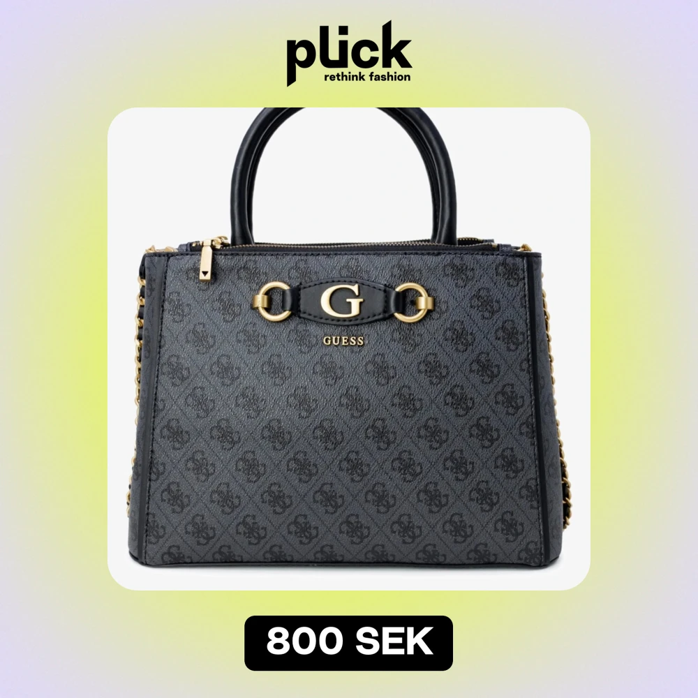 Snygg svart handväska från Guess med gulddetaljer och ett diskret mönster. Väskan har en praktisk dragkedja och kedjedetaljer på sidorna. Perfekt för både vardag och fest!