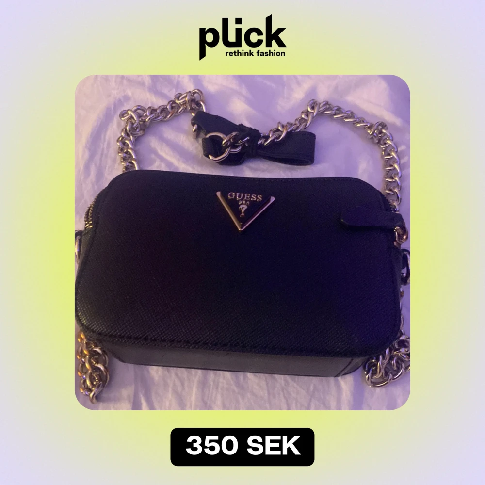 Snygg svart axelväska från Guess med kedjedetaljer och dragkedja. Perfekt för en kväll ute eller en dag på stan. Väskan har en stilren design med Guess-logga framtill.Den är inte använd heller.Den är dessutom äkta.