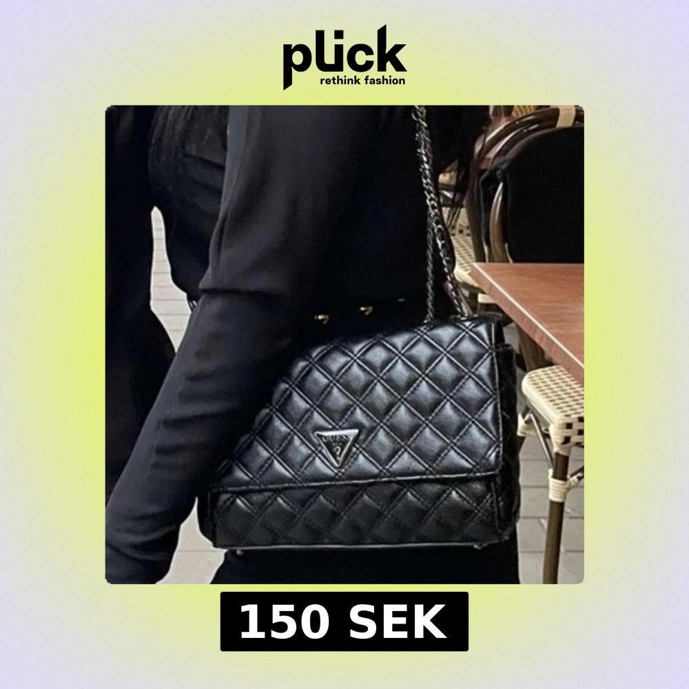 Snygg svart axelväska från Guess med quiltat mönster och kedjerem. Väskan har en klassisk trekantig Guess-logga framtill och är tillverkad i skinnimitation. Perfekt storlek för att få plats med allt viktigt!