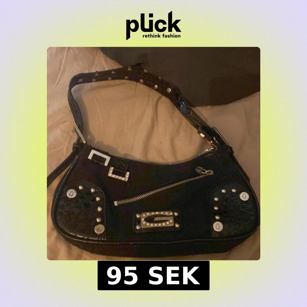 Snygg svart axelväska från Guess (fejk) med coola nitar och dragkedja framtill. Väskan har en justerbar axelrem och dekorativa detaljer i silver. Perfekt för att ge din outfit en edgy touch.