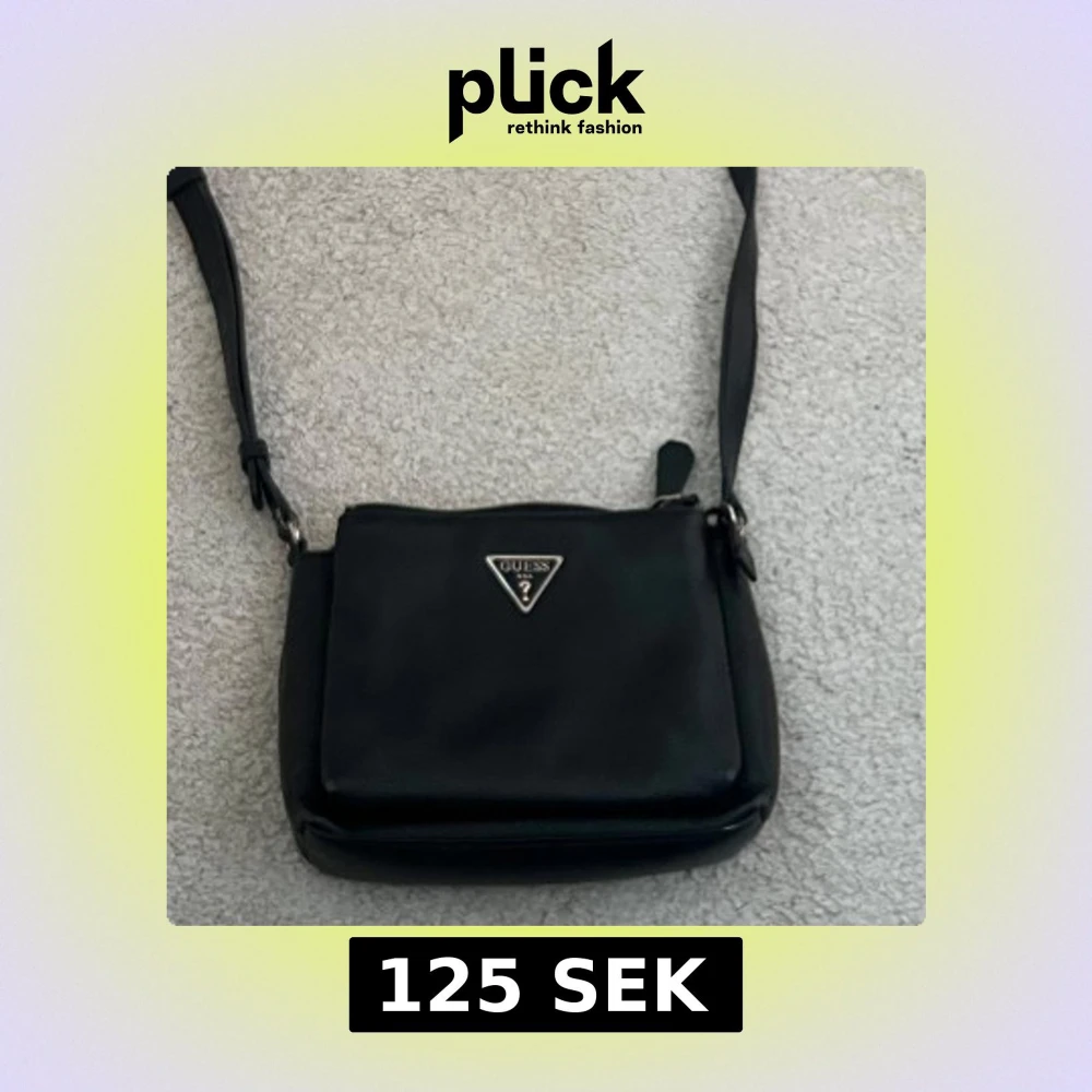 Snygg svart axelväska från Guess med justerbar axelrem och en stilren design. Väskan har en metallogo på framsidan och är perfekt för att bära dina nödvändigheter. Enkel att matcha med olika outfits.