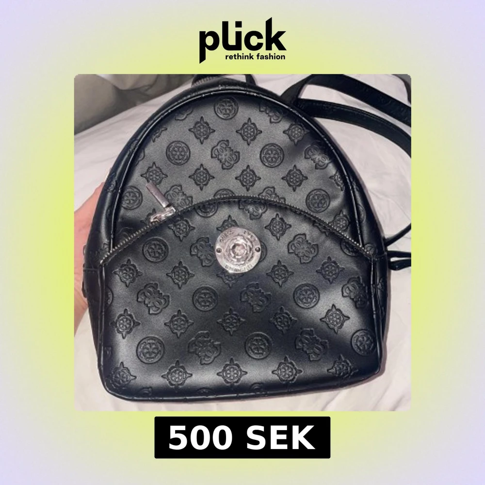 Säljer en svart ryggsäck från Guess med präglat logomönster över hela väskan. Väskan har en framficka med dragkedja och silverfärgade metalldetaljer. Perfekt storlek för att bära det viktigaste och har justerbara axelremmar.