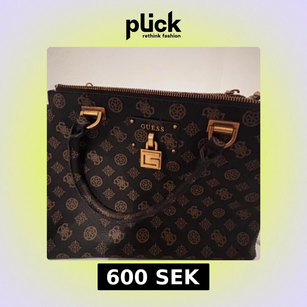 Snygg svart handväska från Guess med bruna monogramdetaljer och guldfärgade metalldetaljer. Väskan har både handtag och en axelrem i kedja, dragkedja upptill och ett dekorativt lås framtill. Perfekt för att lyfta din outfit med en lyxig touch.