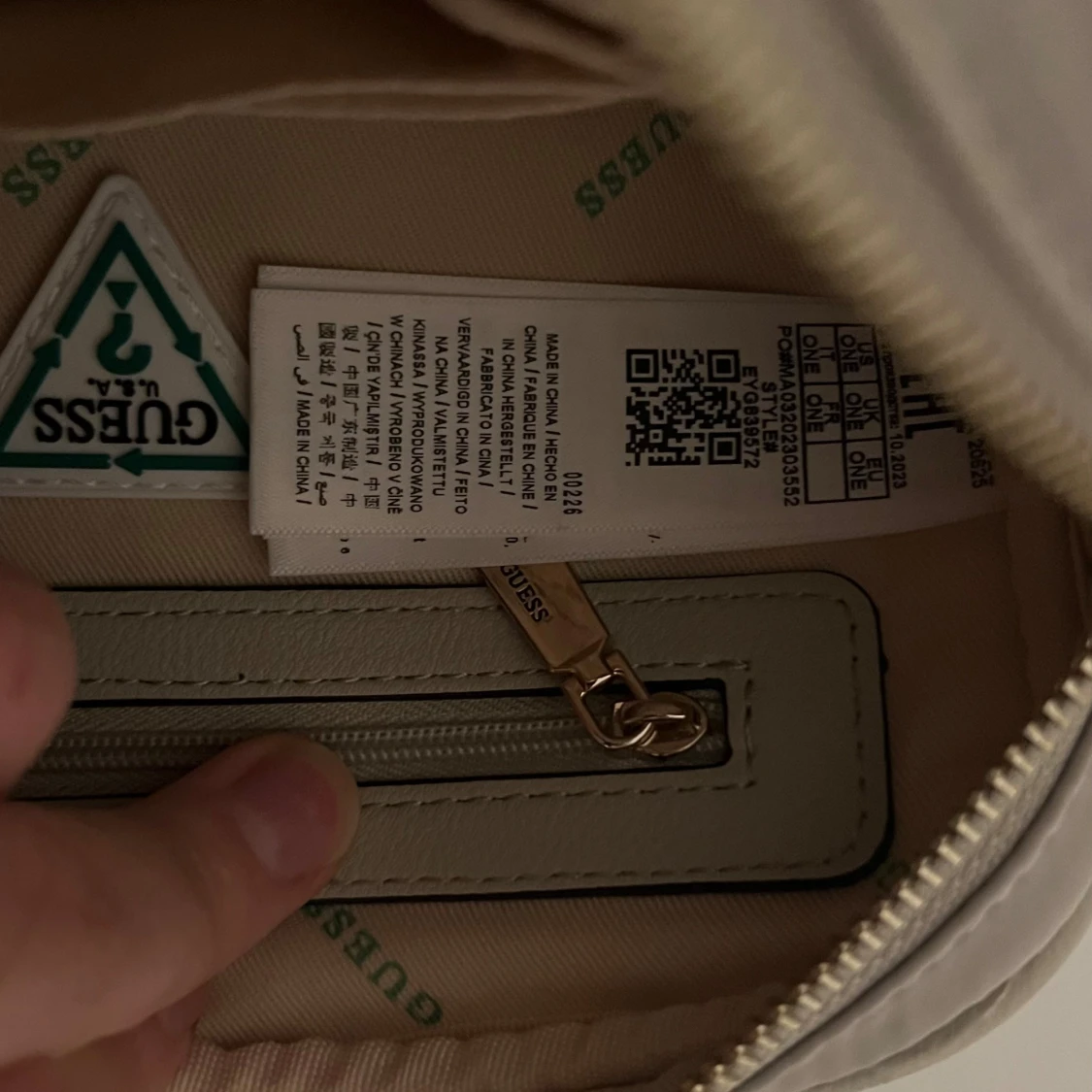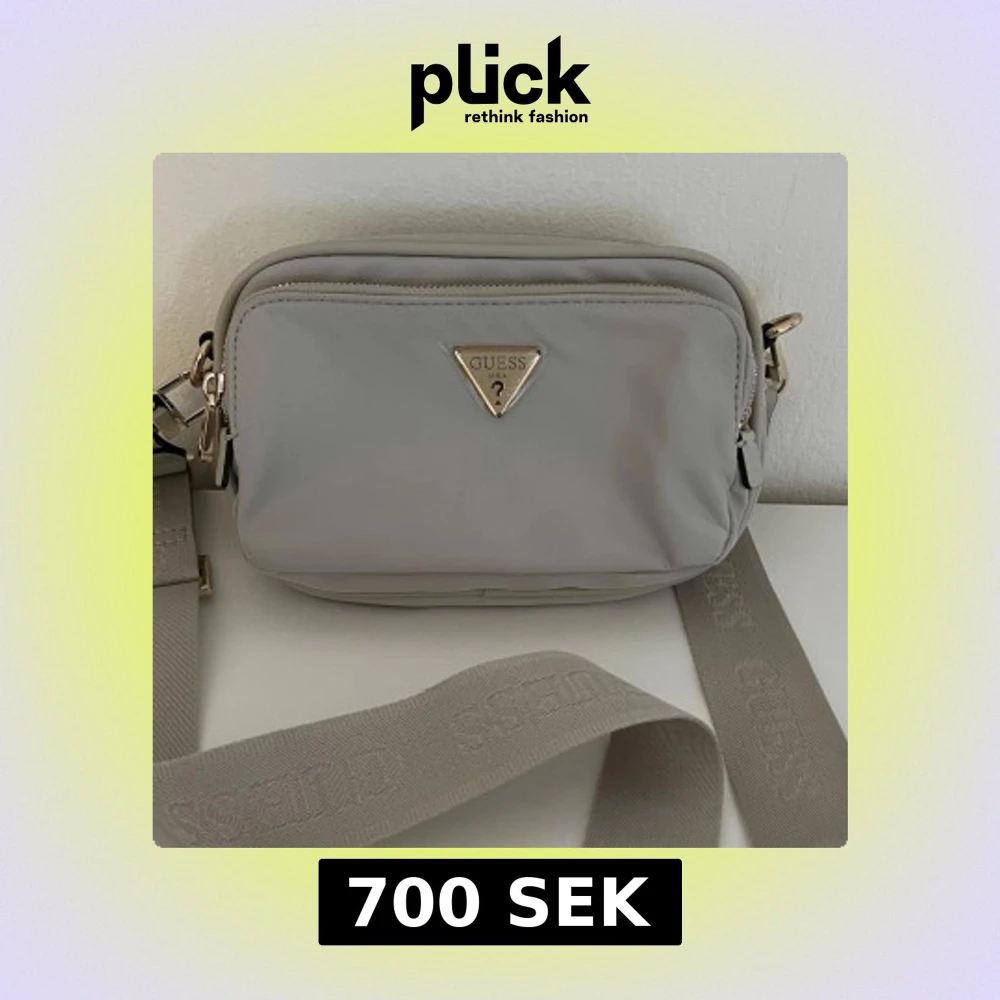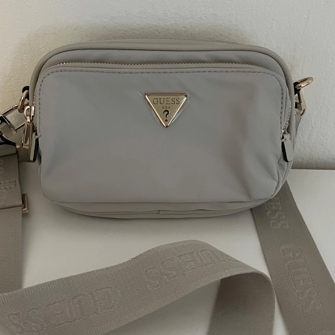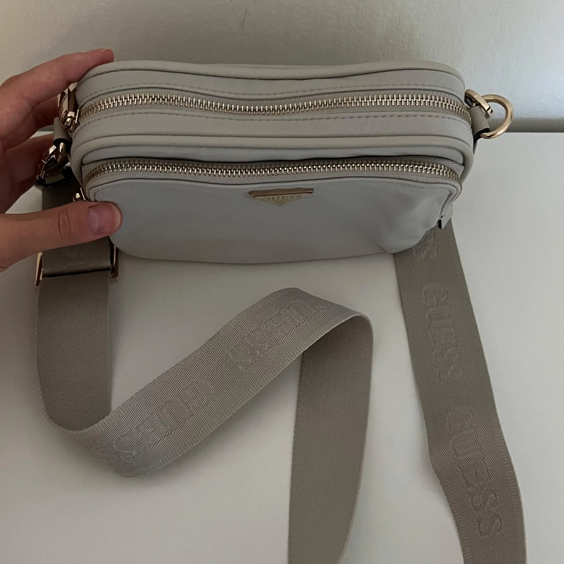 Snygg beige axelväska från Guess med justerbar bred rem och guldfärgade detaljer. Väskan har två stora fack med dragkedja och ett mindre innerfack. Guess-logga i metall framtill och diskret logotyp på remmen. Perfekt storlek för mobilen och det viktigaste.OBS väskan är original och använd 1 gång.