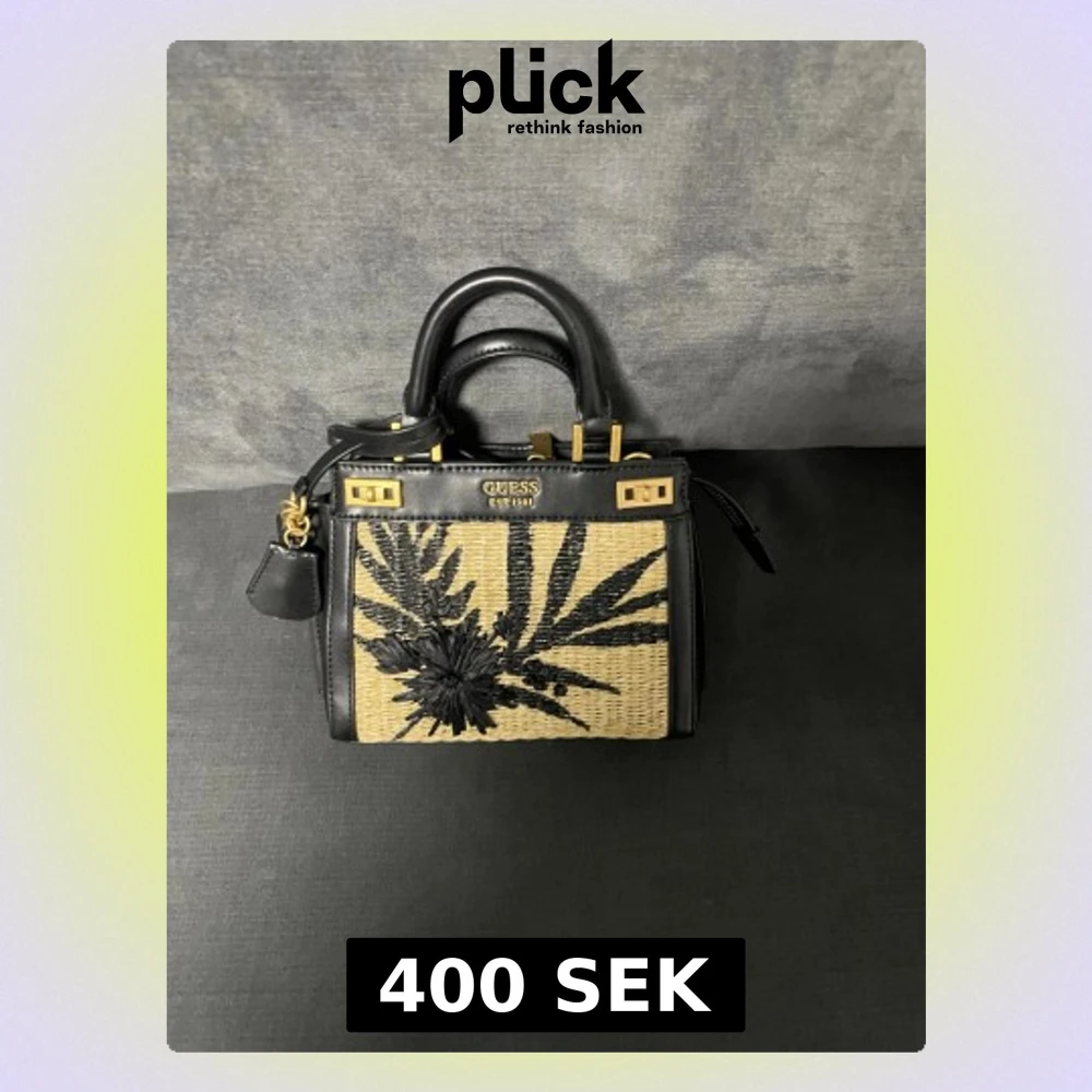 Snygg handväska från Guess med svart och beige flätad design, dekorerad med svart broderat blommönster på framsidan. Väskan har svarta skinn-detaljer, guldfärgade metalldelar och dragkedja upptill. Kommer med både handtag och avtagbar axelrem.// den är 20 cm kanske