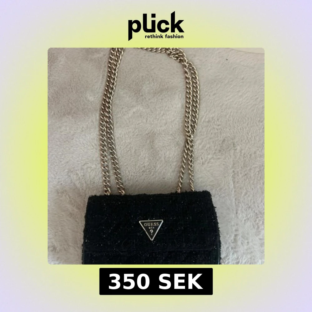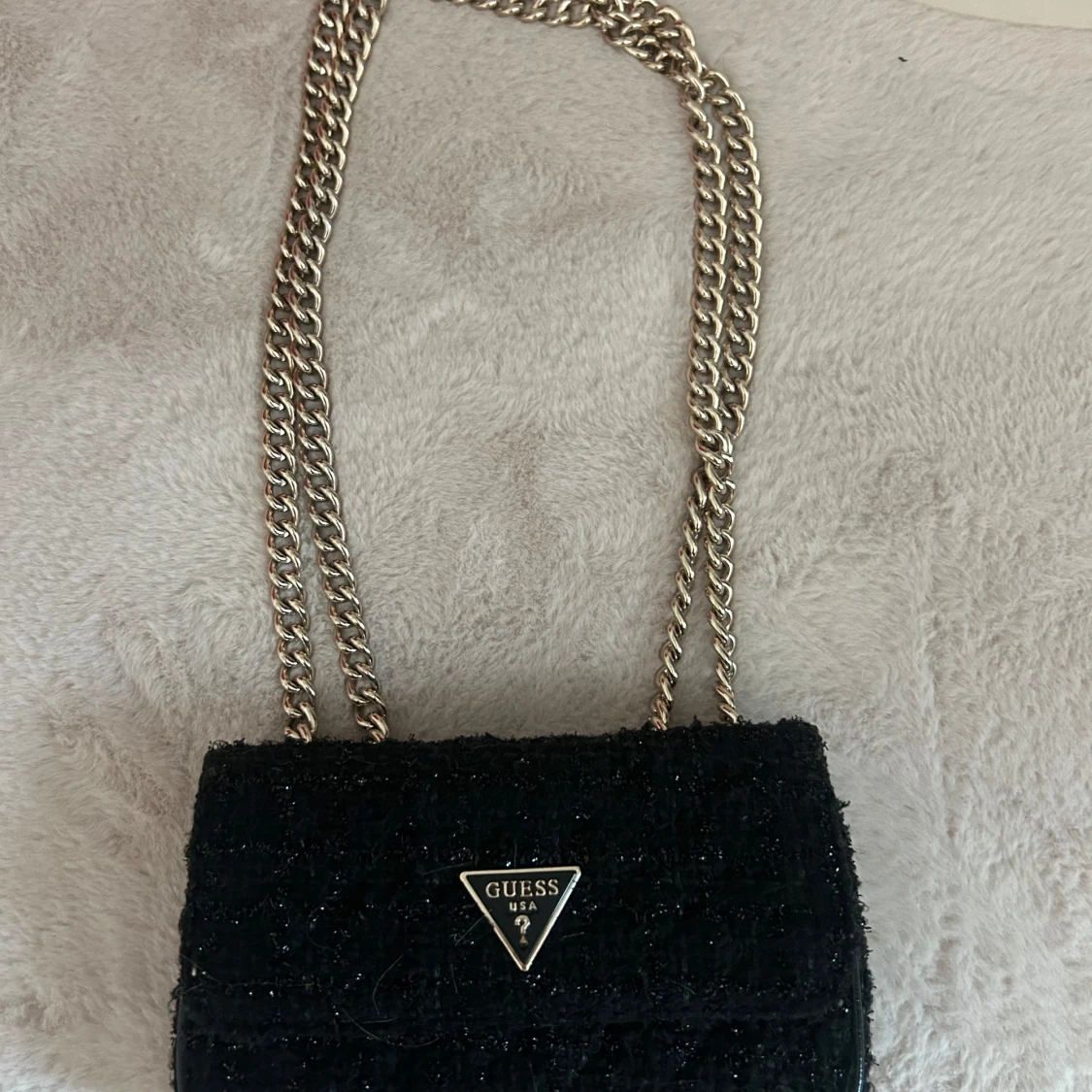 Snygg svart axelväska från Guess med glansig textur och guldfärgad kedjerem. Väskan har klassisk trekantslogga framtill och en kompakt, stilren form som passar perfekt till din outfit.