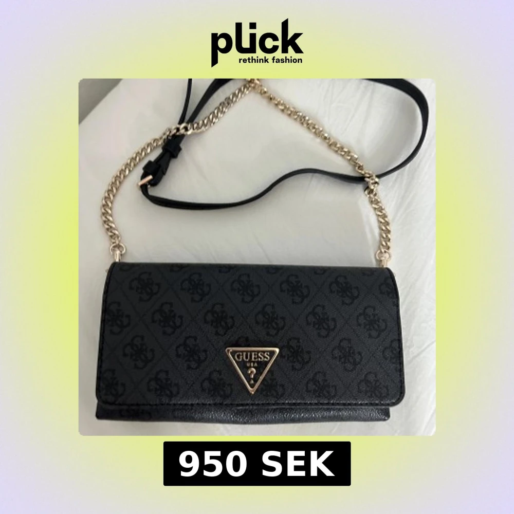 Snygg svart axelväska från Guess med silver kedja och läderrem. Väskan har Guess-logga framtill, diskret mönster, dragkedja på baksidan och flera fack för kort och småsaker inuti. Perfekt storlek för det viktigaste och riktigt stilren look. Väskan har aldrig använt.