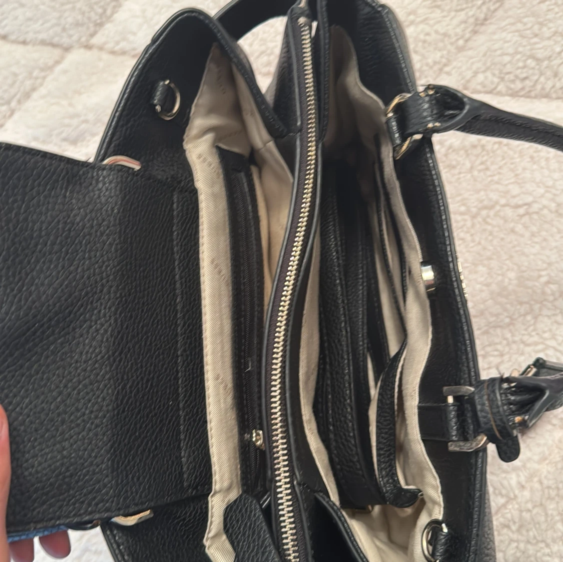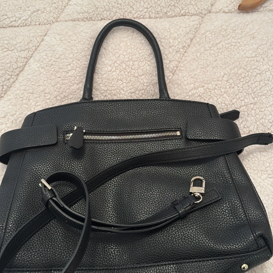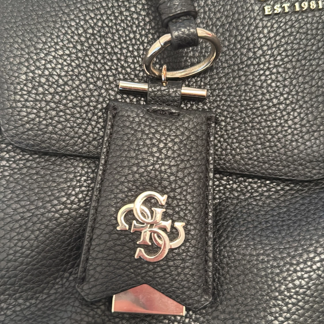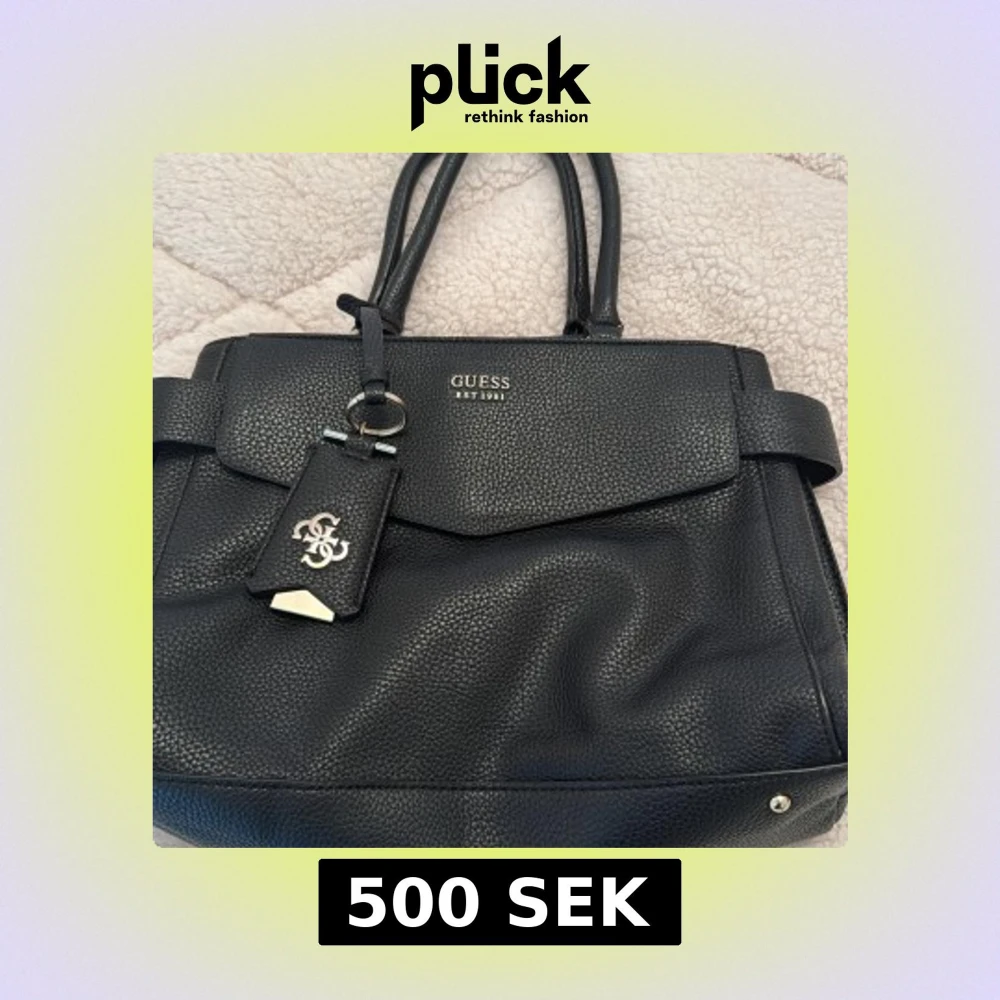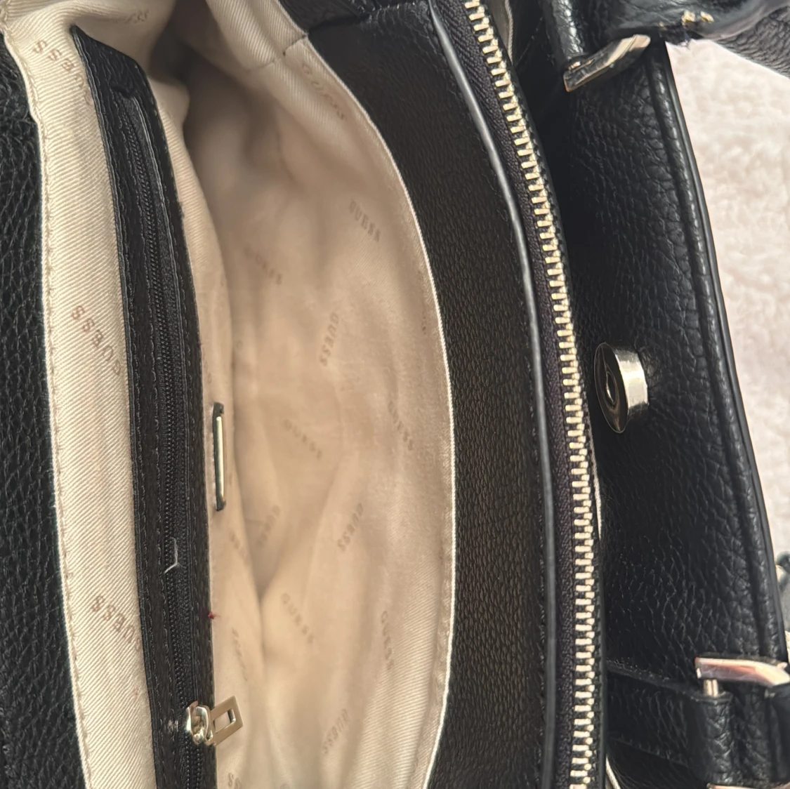 Säljer en stilren svart handväska från Guess med silverdetaljer och logotyp framtill. Väskan har flera fack, både med dragkedja och magnetlås, samt ljus insida med Guess-tryck. Perfekt för att bära med sig det viktigaste.