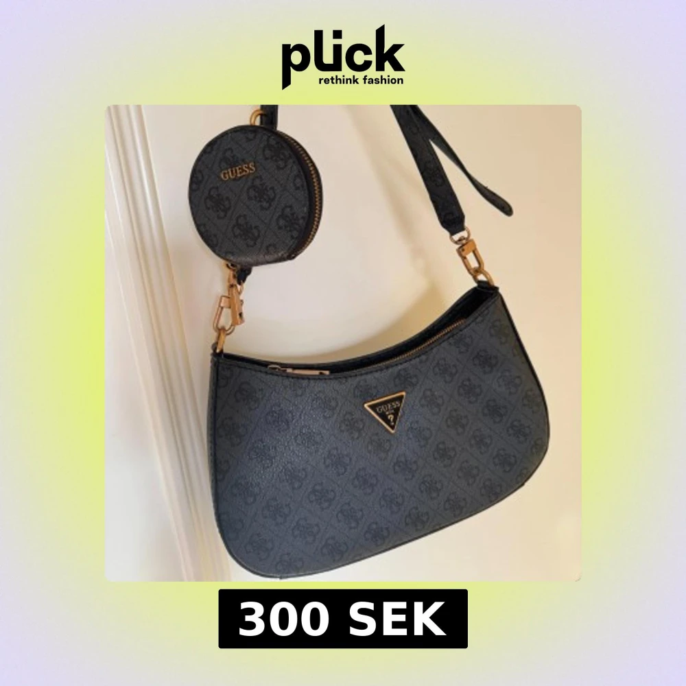 Svart axelväska från Guess med matchande rund plånbok. Väskan är i nyskick. Använd vid få tillfällen.