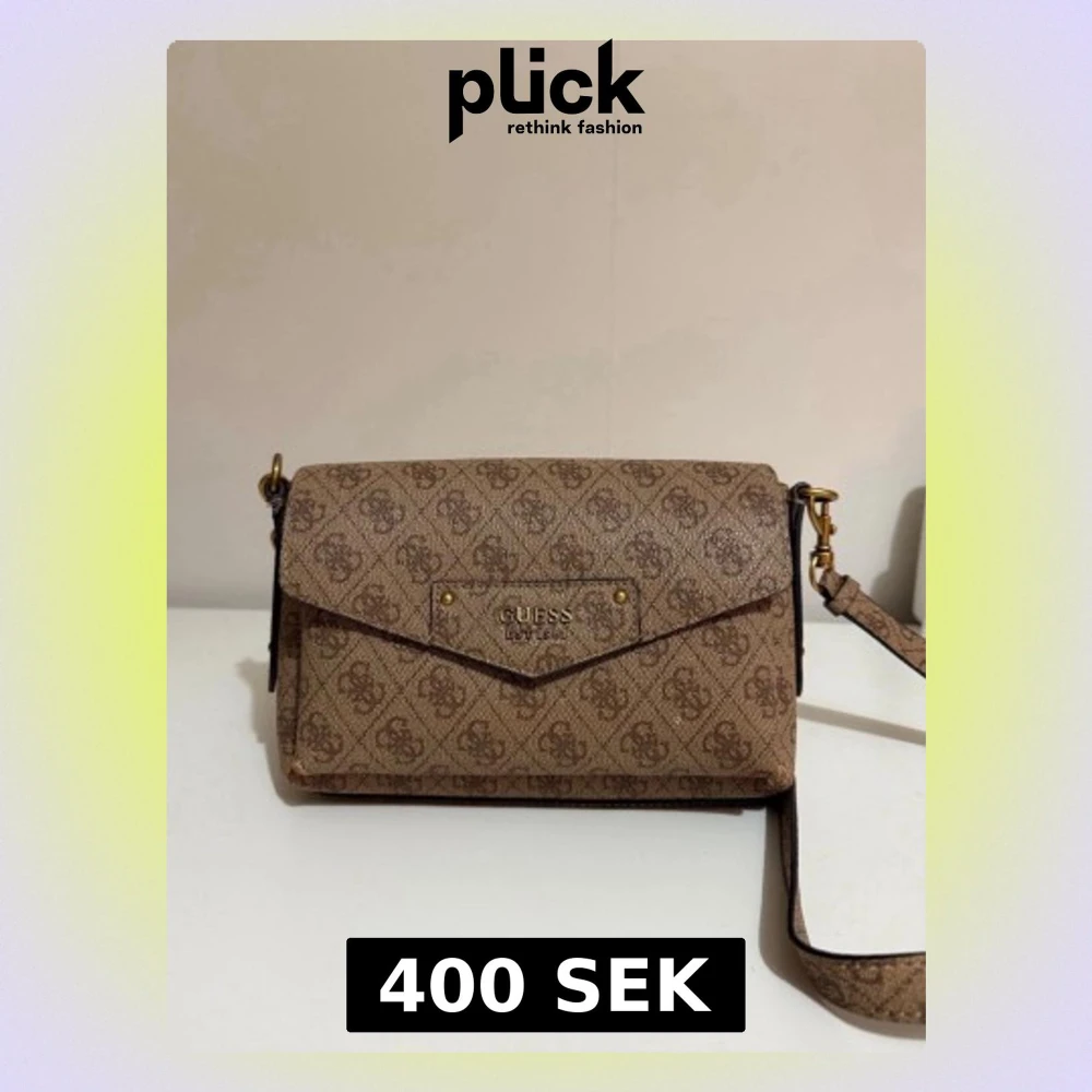 Brun axelväska från Guess med logomönster över hela väskan. Väskan har guldfärgade metalldetaljer, justerbar axelrem och flera fack inuti. Stängs med magnetknapp och har dragkedja på baksidan. Dragkedjan på baksidan har inte en dragare men det funkar ändå!