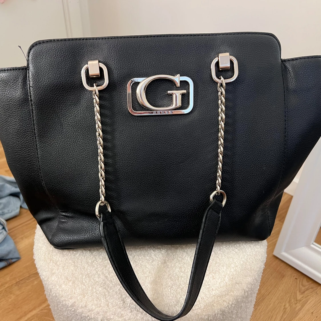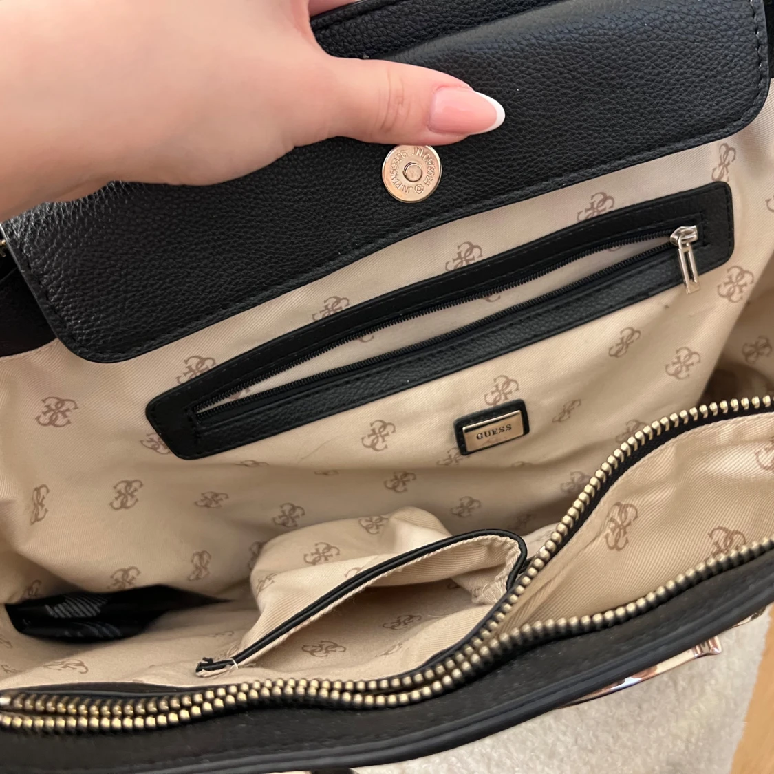 Super snygg Guess väska med snyggt insids tyg och bra med fack på insidan och baksida☺️ skriv vid eventuell köp