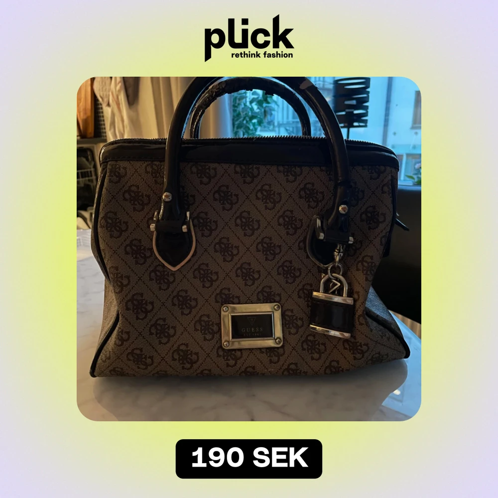 Vintage handväska från Guess, jätte fin men har använts därav är dragkedjan lite trasig (möjlig att fixa) samt handtagen har slitage. I övrigt riktigt snygg och elegant väska! Guld detaljer, berlocker och många innefickor.