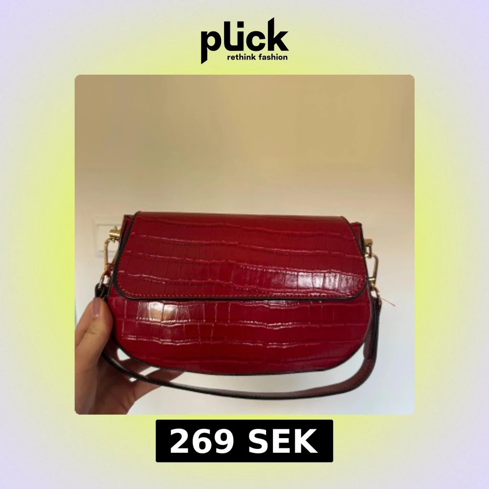 Säljer en snygg röd axelväska med mönster och guldfärgade detaljer. Väskan har ett lock och justerbar axelrem. Perfekt storlek, köpt utomlands och får ingen användning för den endast använt 2 ggr, så gott som ny.